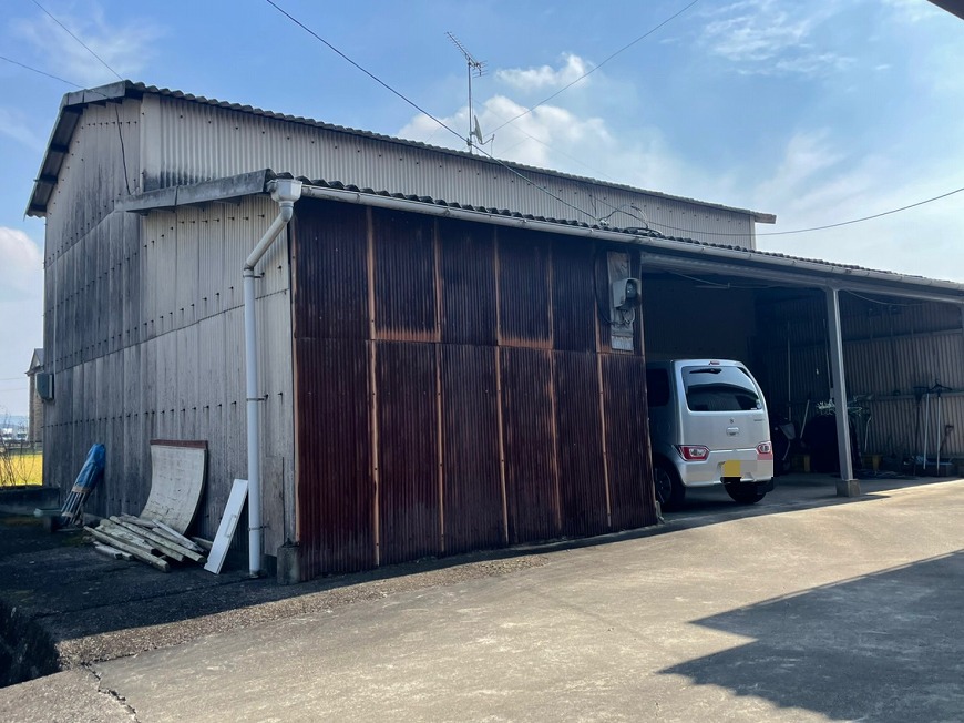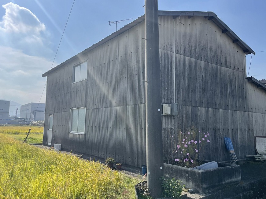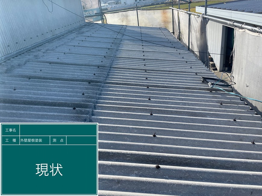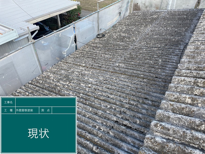 屋根は塗膜がなく、コケが生えていた。金具も錆びていた。トタンは錆だらけでぺらぺらになっていた。雨樋は経年劣化により変形しており、雨樋の役目を果たしていなかった。