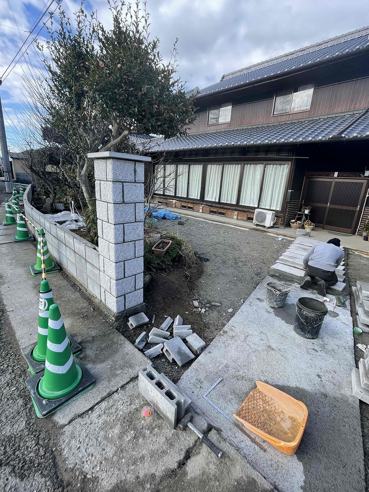 1.ブロック塀の解体 2.排水の工事 3.土の掘り起こし 4.ブロック3段積む 5.カーポートの柱を立てる 6.土間打ち 7.アプローチの石を置く 8.アルミフェンスとカーポートの屋根の取付