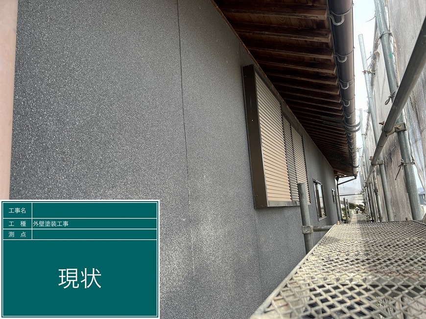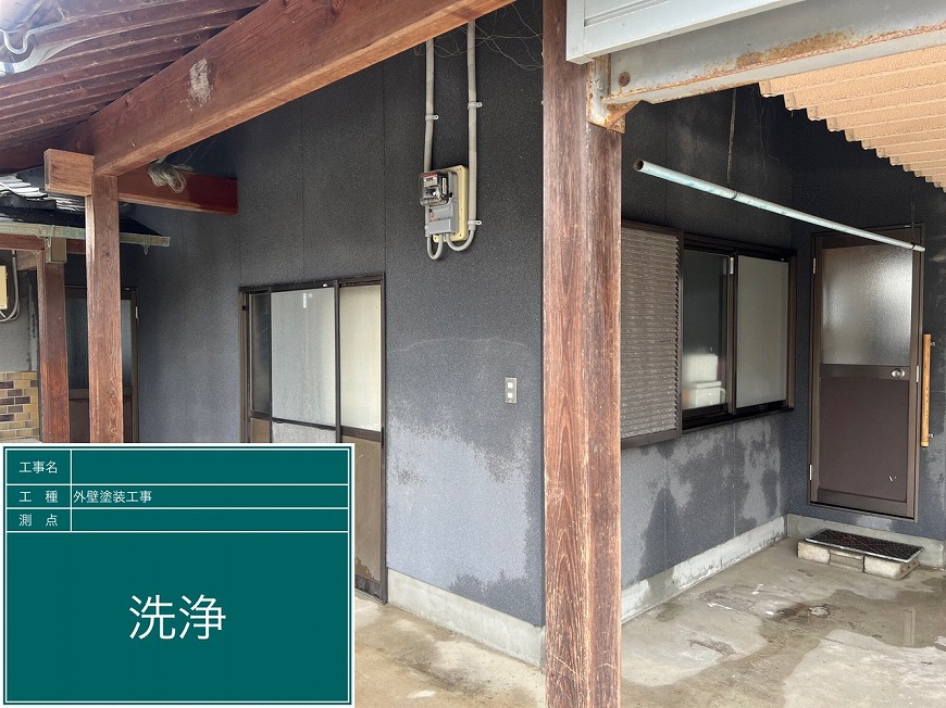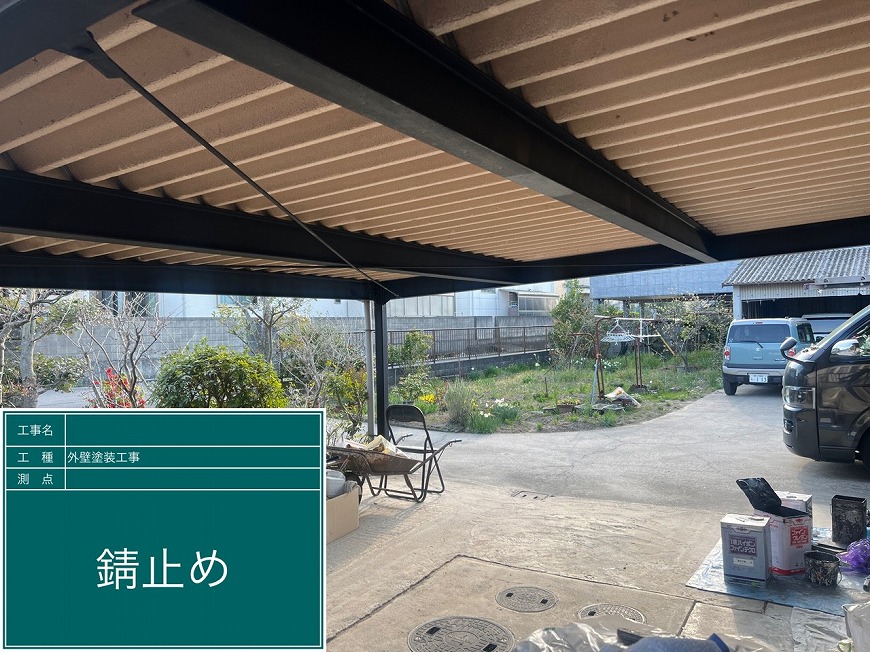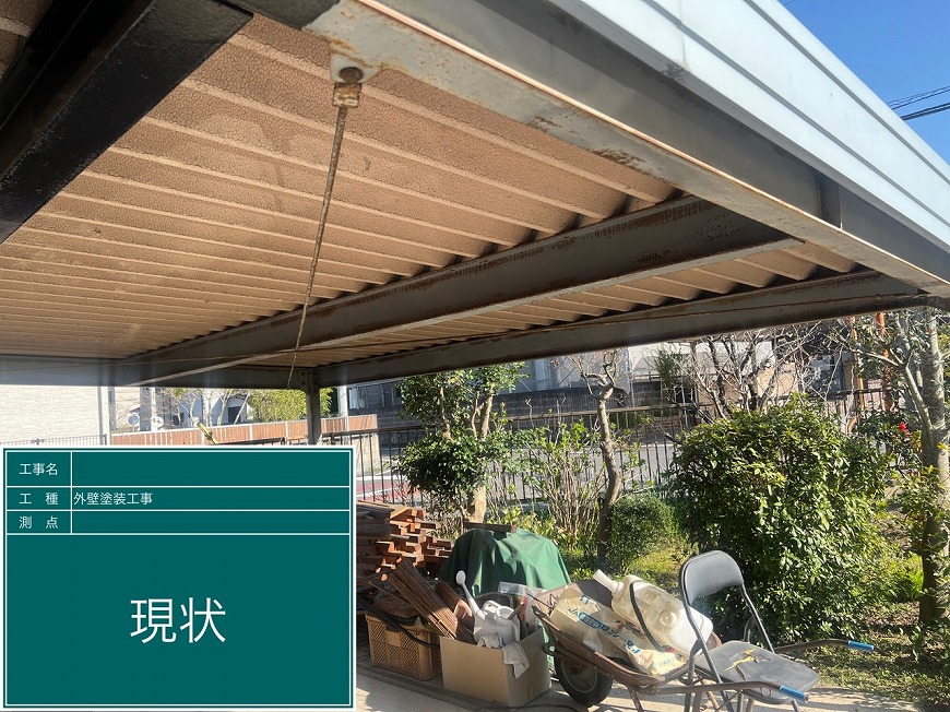 外壁は塗膜がなくなって色褪せていた。車庫は鉄骨部分に錆が出てきていた。