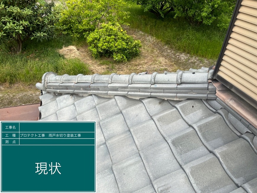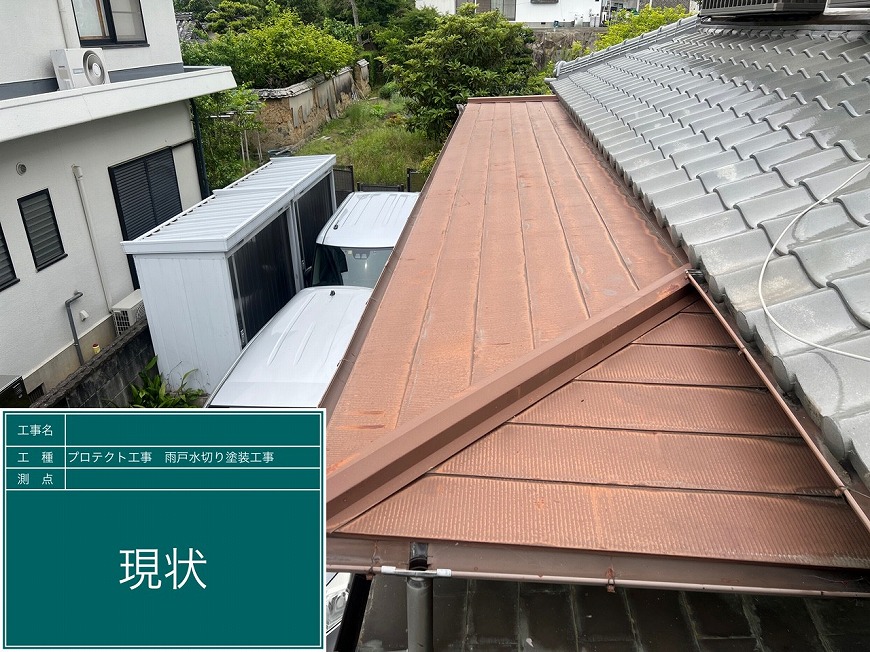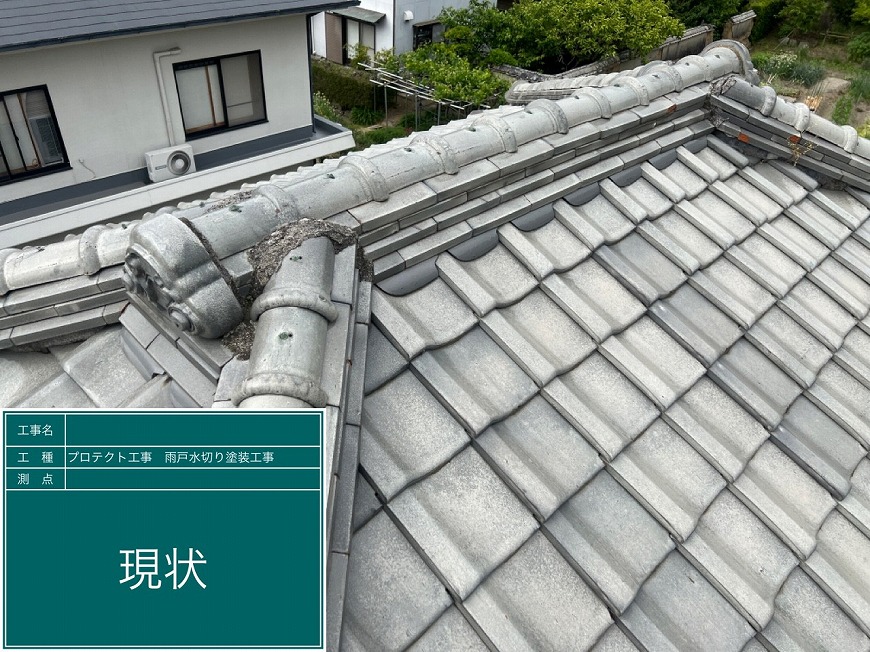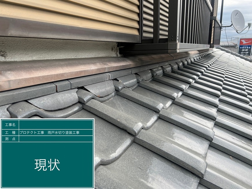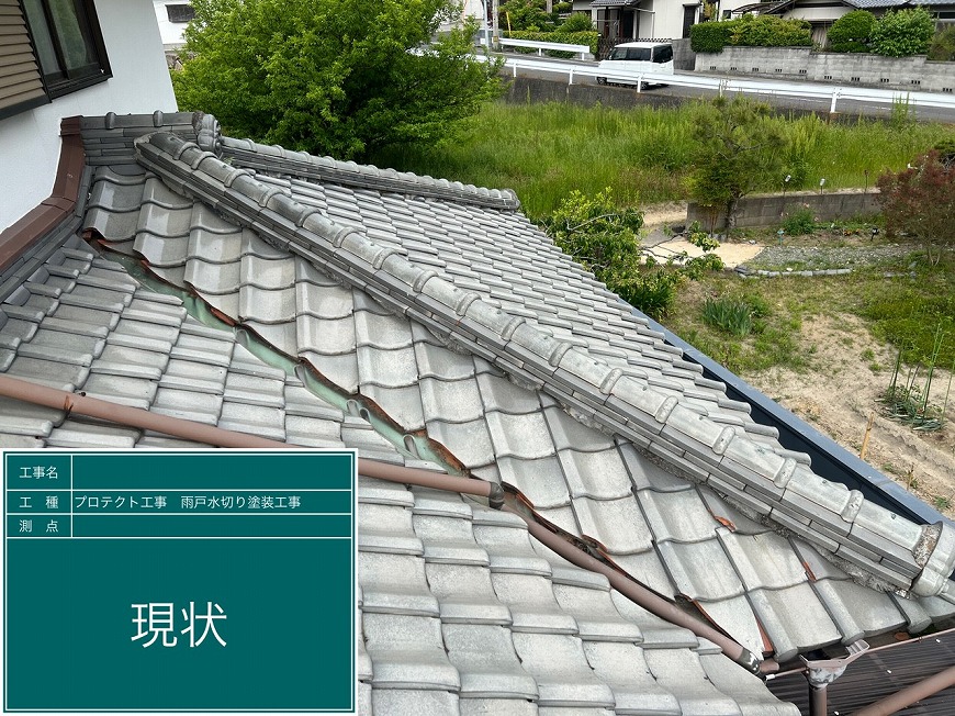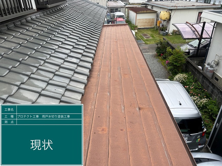 屋根は漆喰が多数取れており、強い雨風等が吹くときに雨漏りがしていた。谷の瓦が落ちており隙間があいていたのと、その周辺の瓦が浮いていた。水切り、戸袋雨戸、屋根全ての板金部分の塗膜がなく、錆が出てき始めていた。