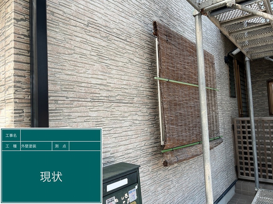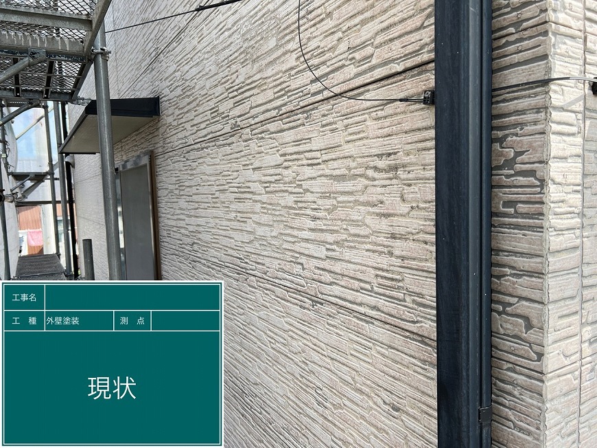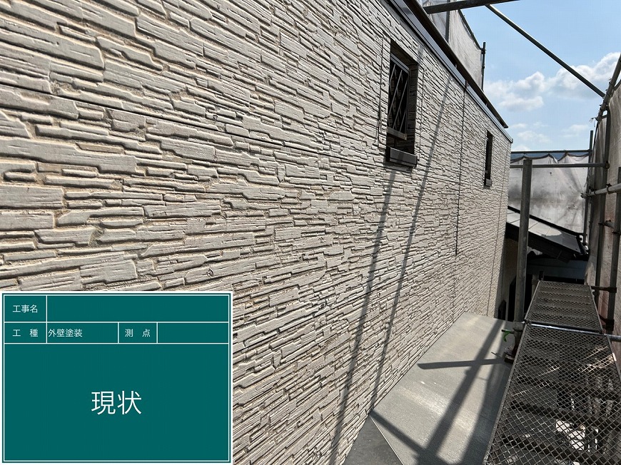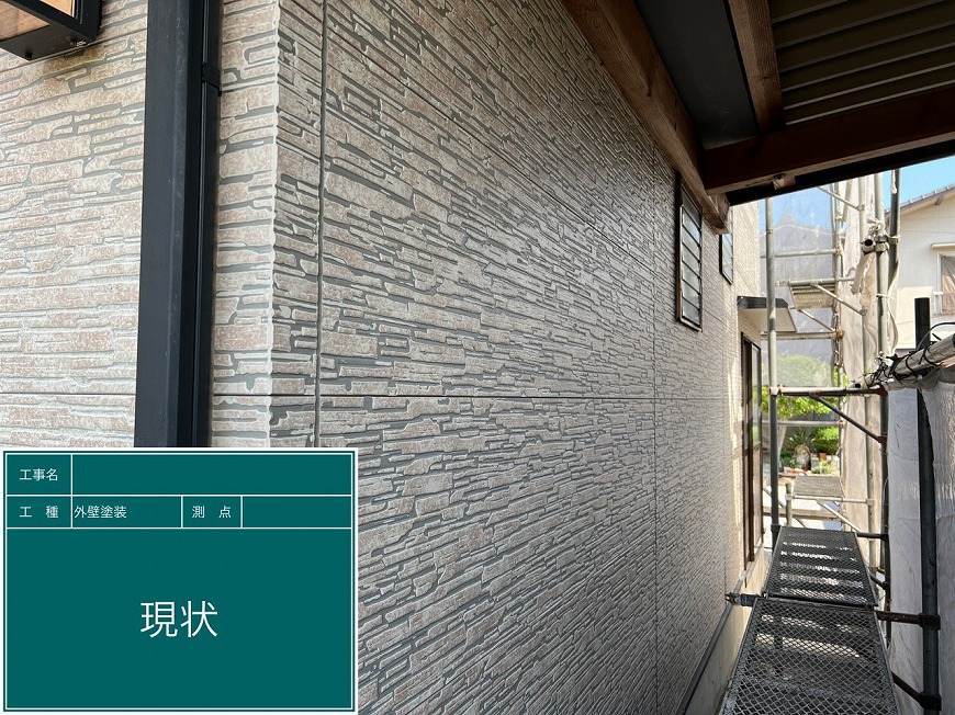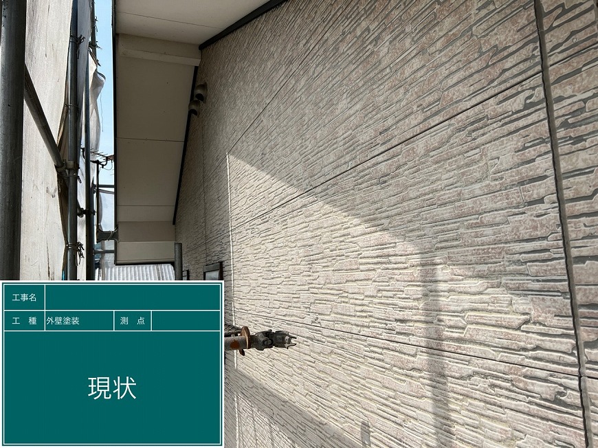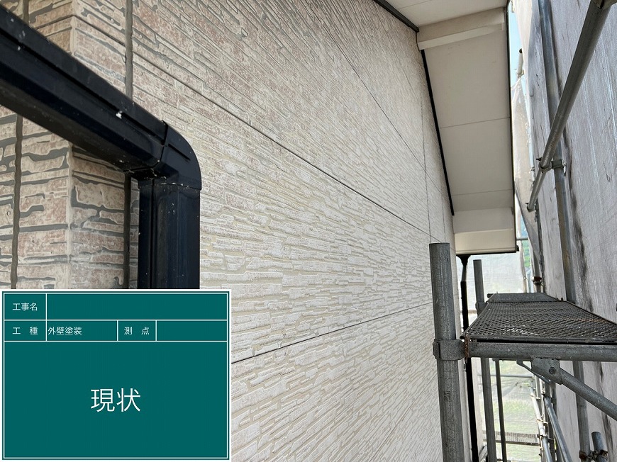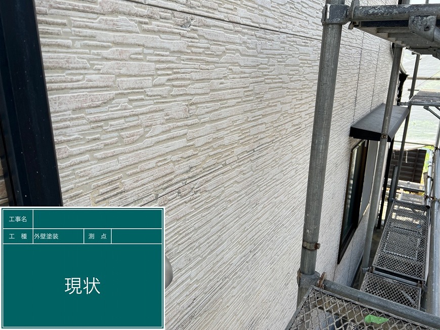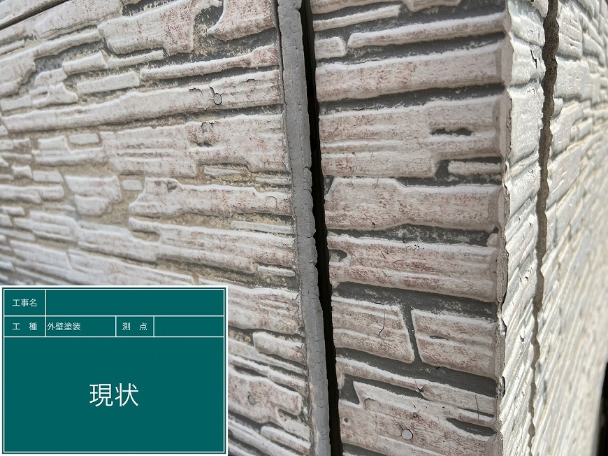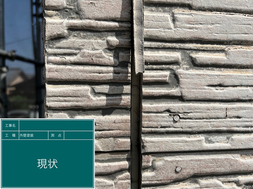 外壁は塗膜が薄くなってきていた。 目地はほとんど割れていて雨水が浸水している状態で、一部壁が反っていたところもあった。庇は塗膜がなく、錆が出る手前の状態だった。