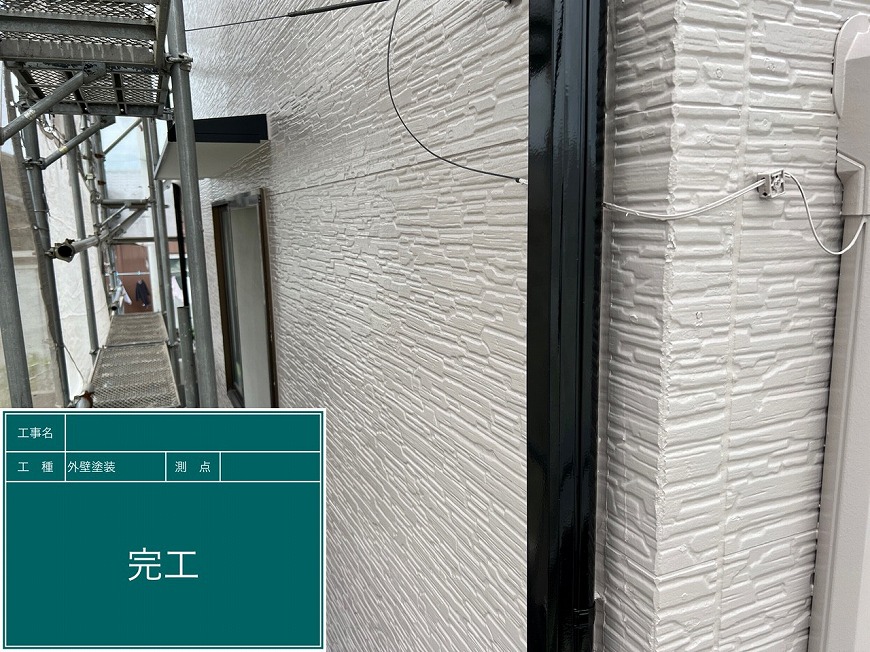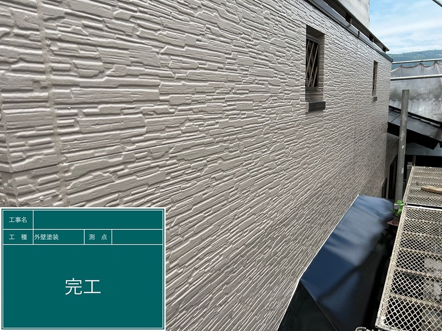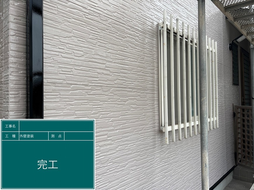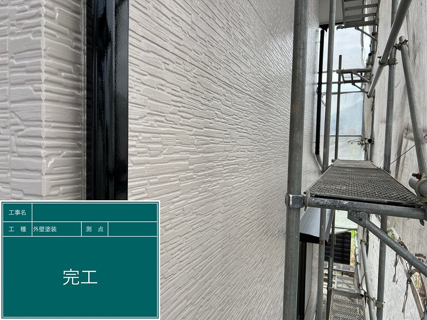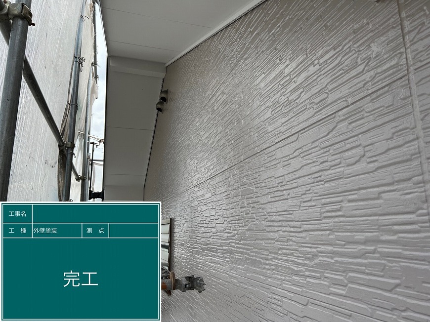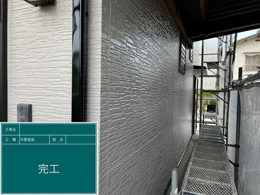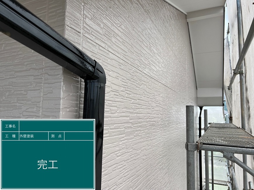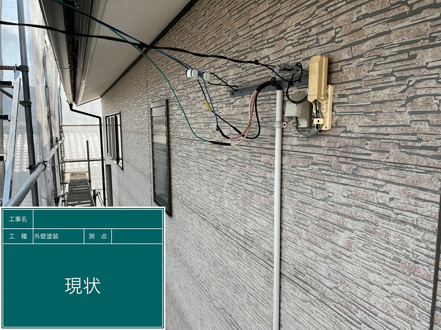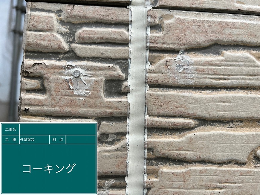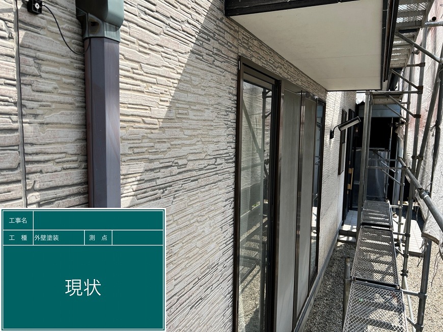外壁は塗膜が薄くなってきていた。 目地はほとんど割れていて雨水が浸水している状態で、一部壁が反っていたところもあった。庇は塗膜がなく、錆が出る手前の状態だった。