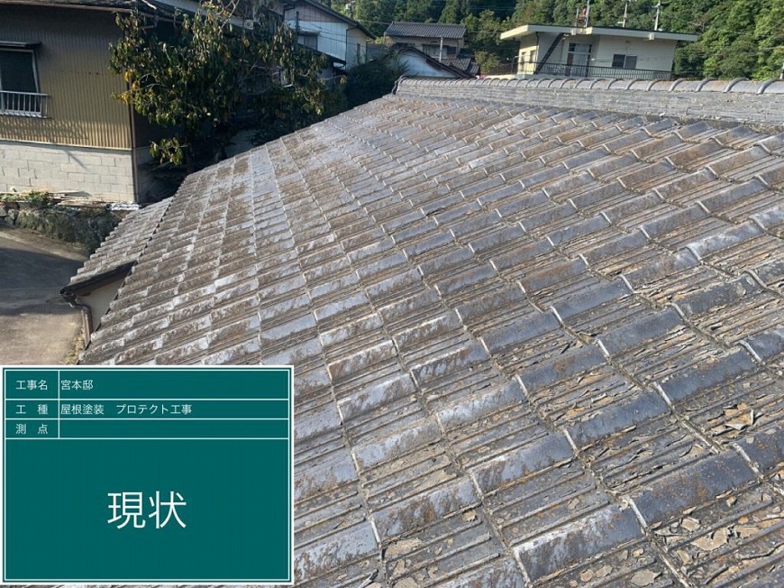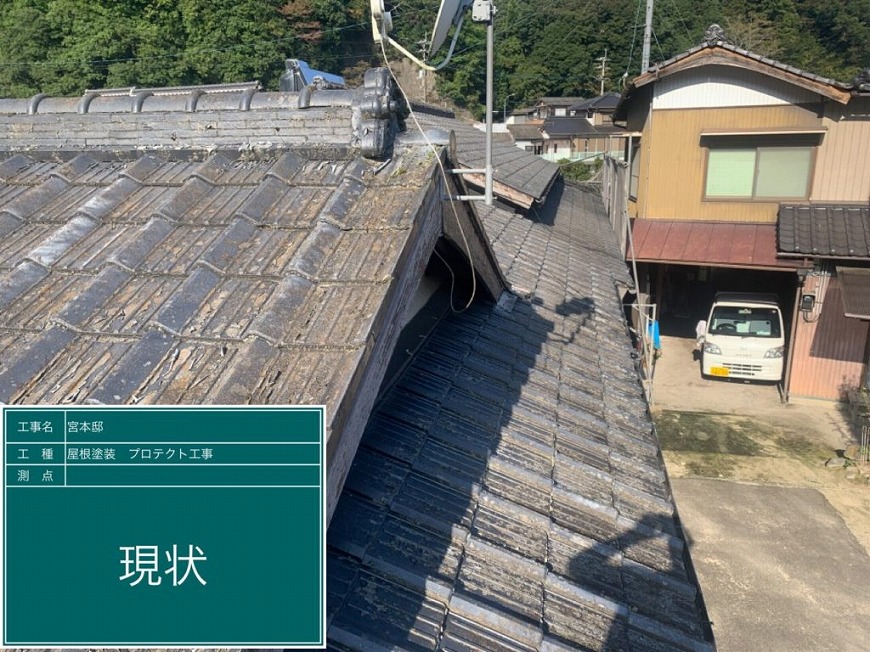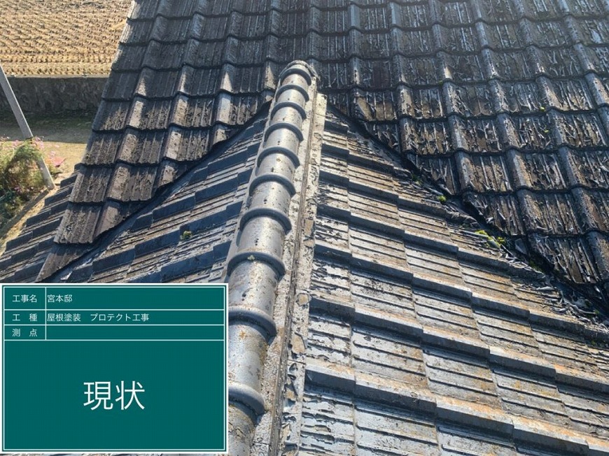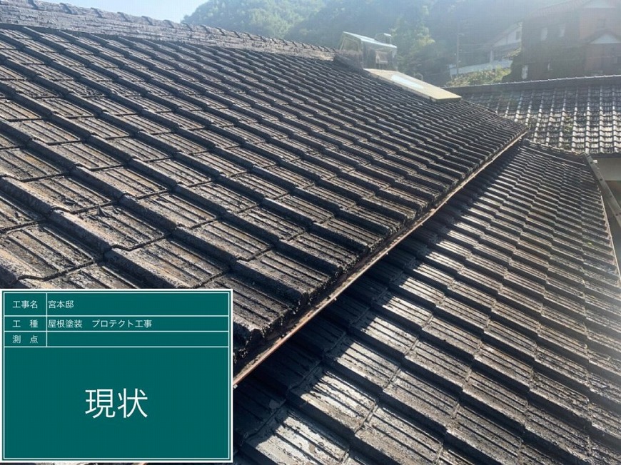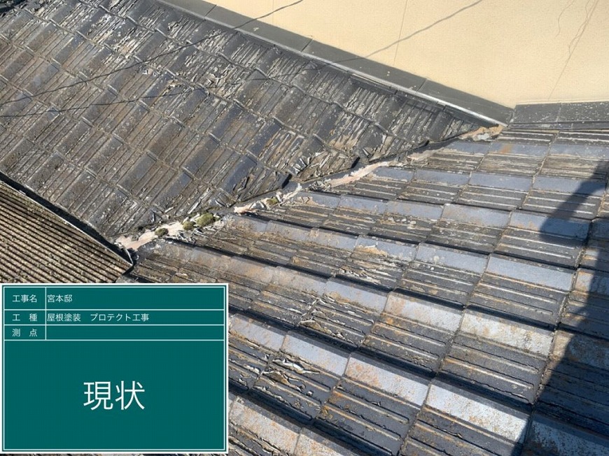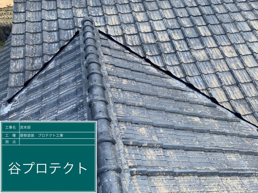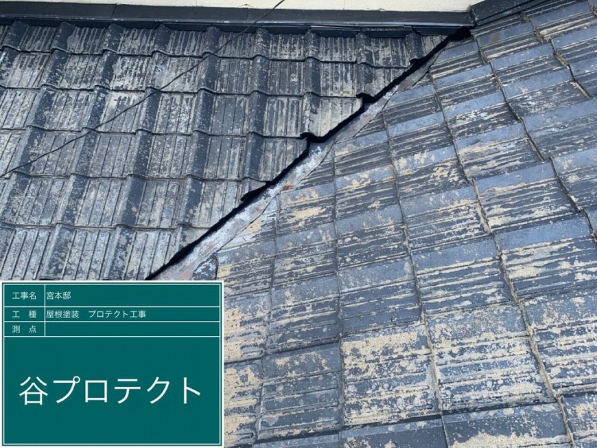 屋根の塗膜が剥がれていた。谷の瓦がずれ落ちていた。