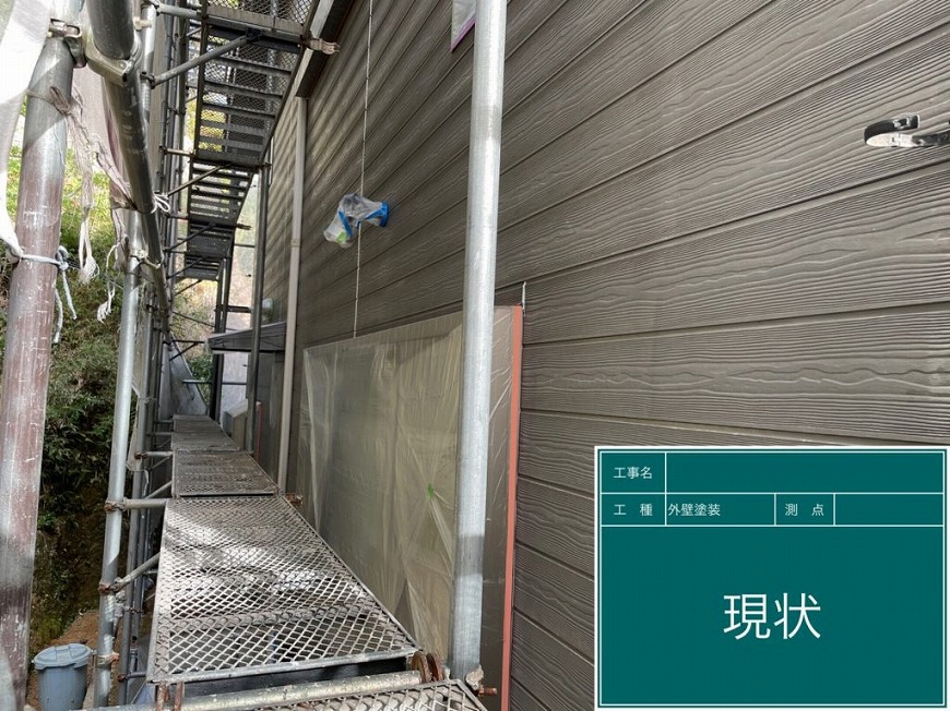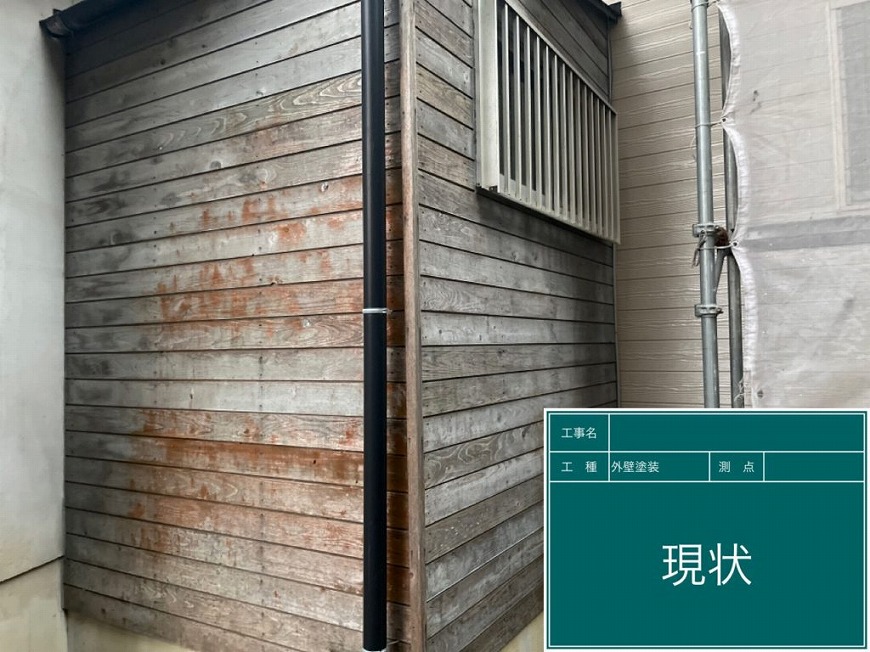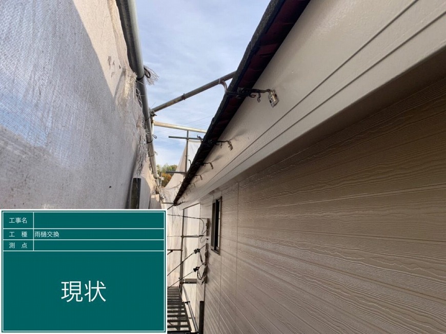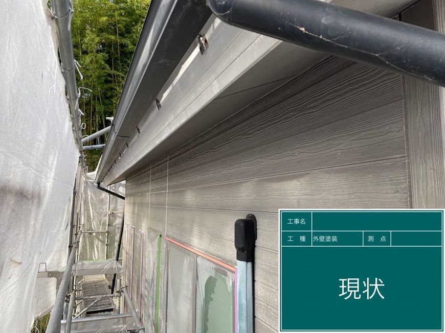 外壁の目地が割れていた。外壁の塗膜もなかった。雨樋は劣化しており機能を果たしていなかった。