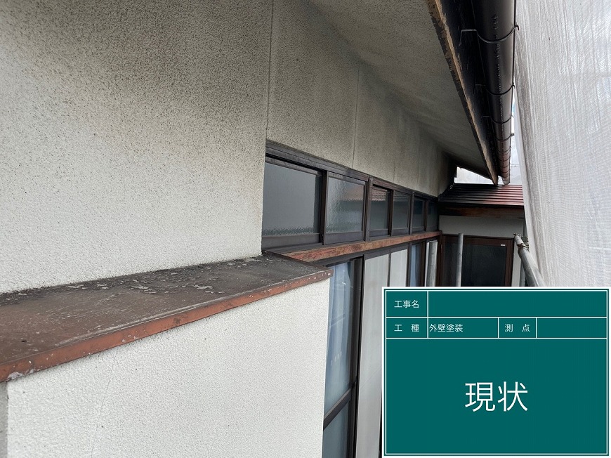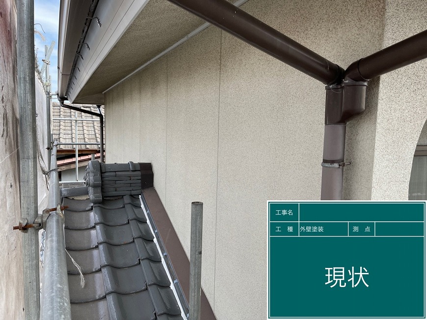 外壁は塗膜がなく、クラックが多数あった。雨樋は乾いていた。釉薬瓦は割れ・浮き・ズレ・落下があった。波板は古くなっていた。
