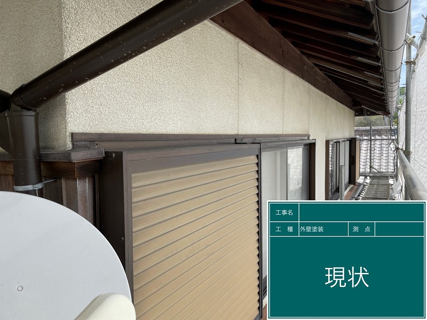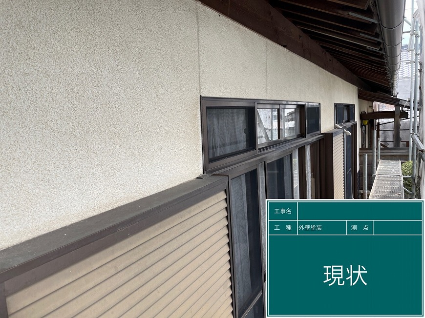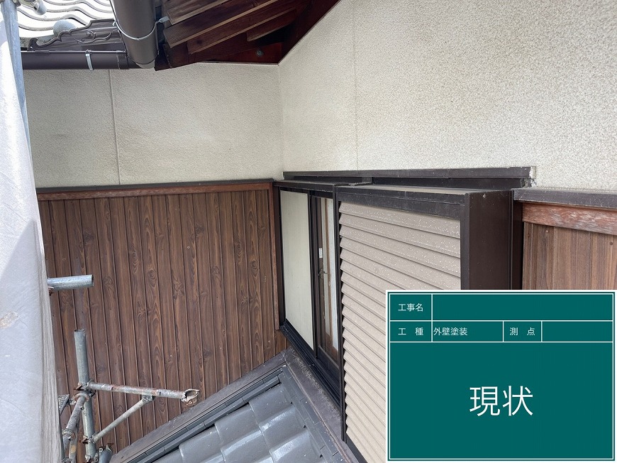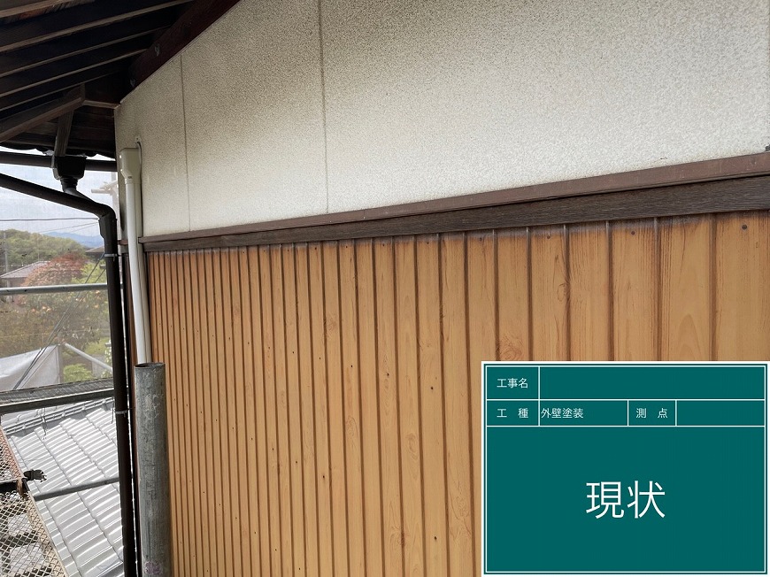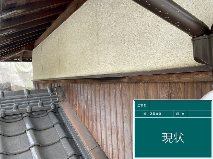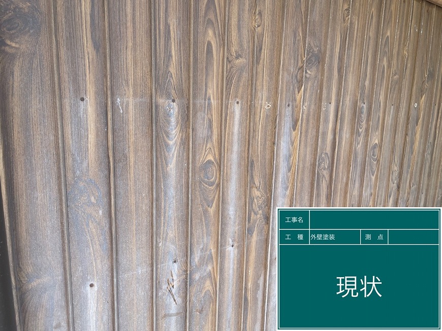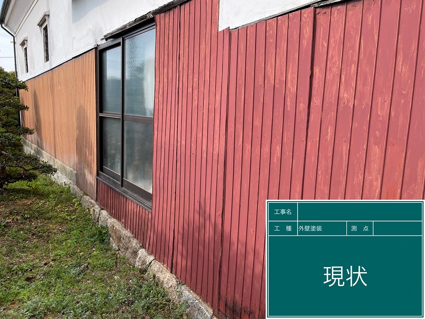 モルタル壁は塗膜がなく、チョーキングが起きていた。トタン壁は塗膜がなくなっていた。納屋のトタン壁も塗膜がなくなっていた。戸袋は塗膜がなくなっていた。屋根は漆喰が数十か所取れており、瓦も数枚落ちていて、割れもあった。