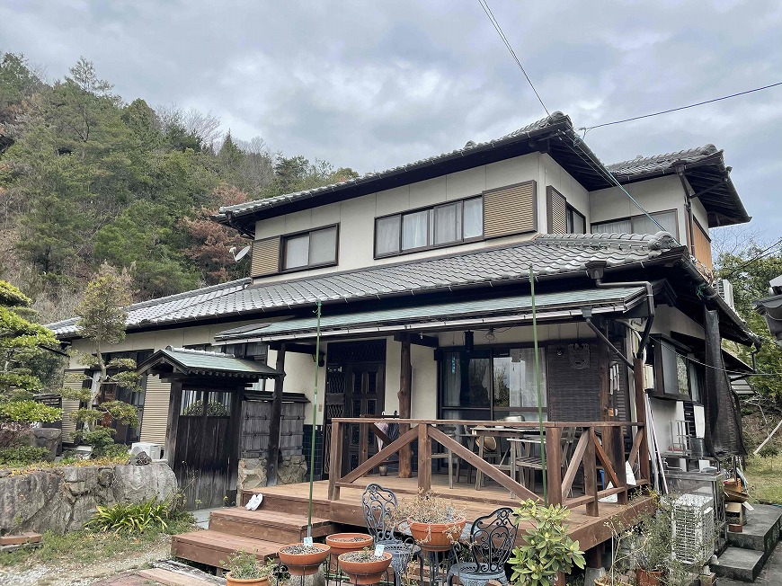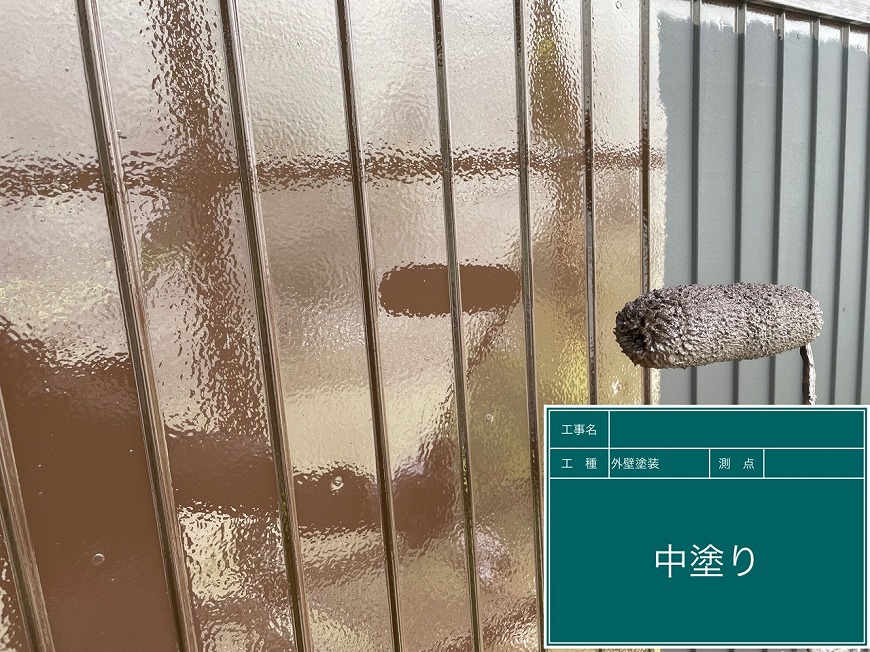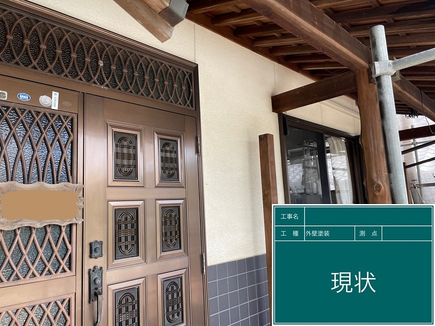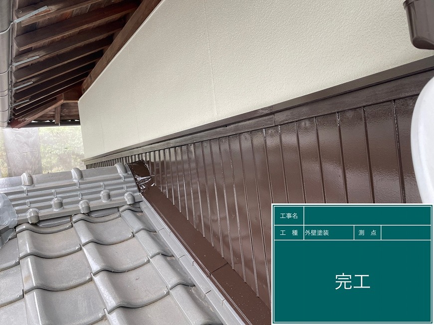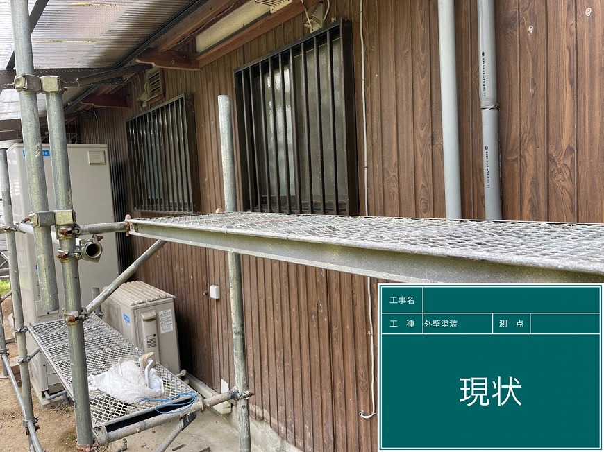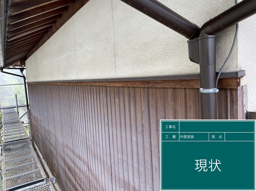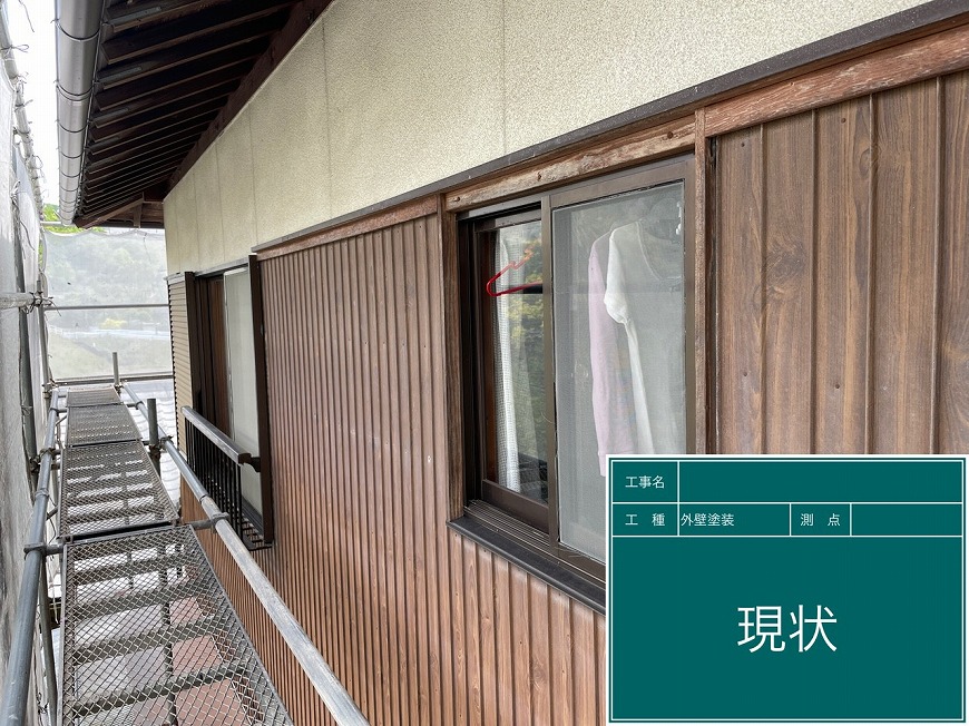 モルタル壁は塗膜がなく、チョーキングが起きていた。トタン壁は塗膜がなくなっていた。納屋のトタン壁も塗膜がなくなっていた。戸袋は塗膜がなくなっていた。屋根は漆喰が数十か所取れており、瓦も数枚落ちていて、割れもあった。