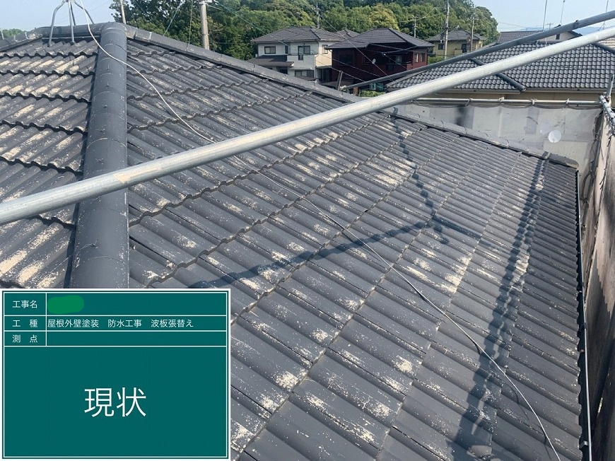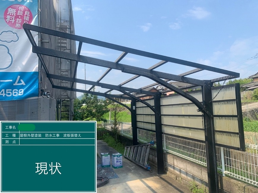 屋根は塗膜がなくなっていた。カーポートの波板は数枚取れていた。