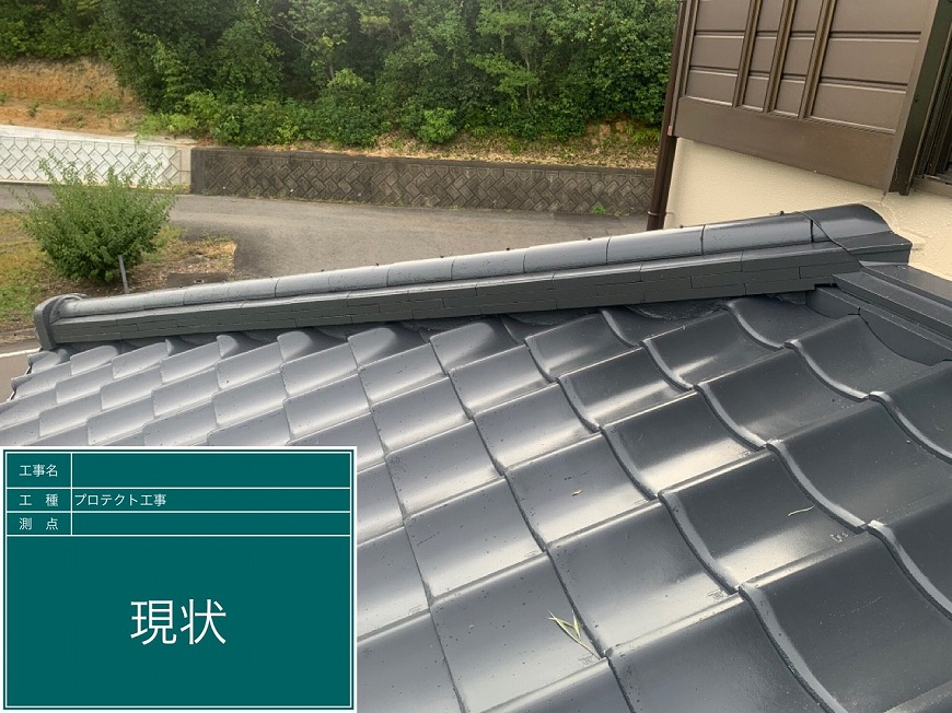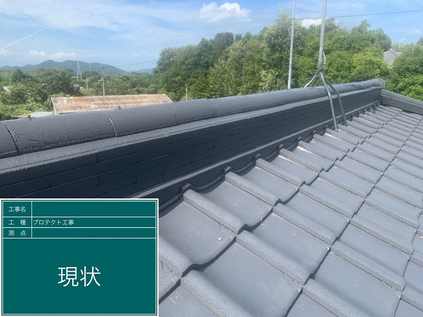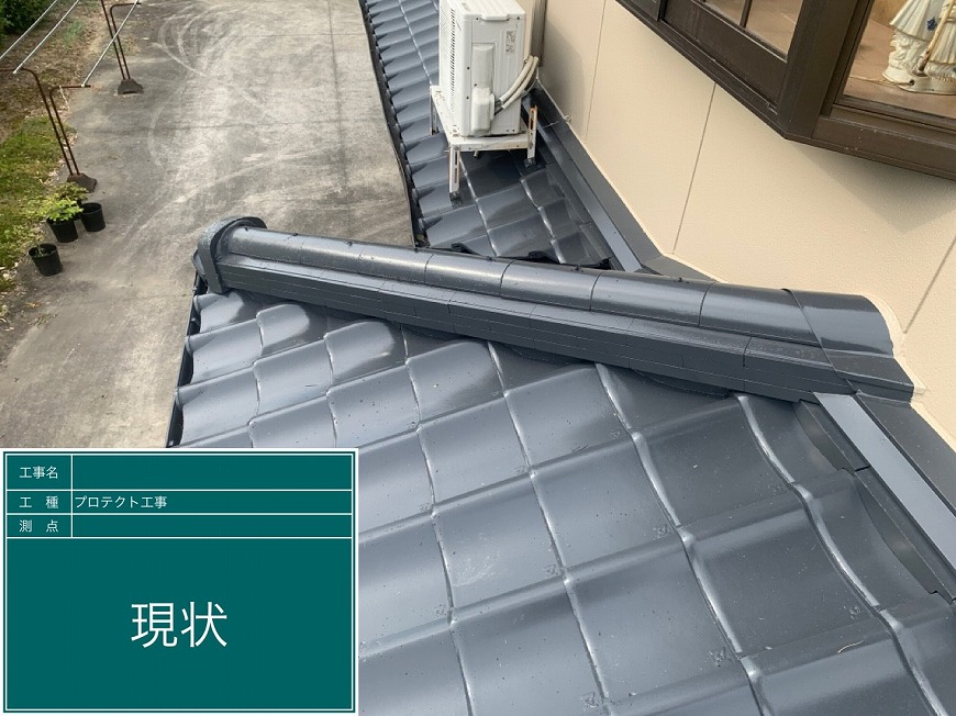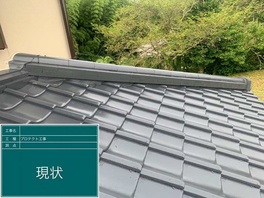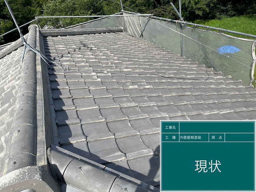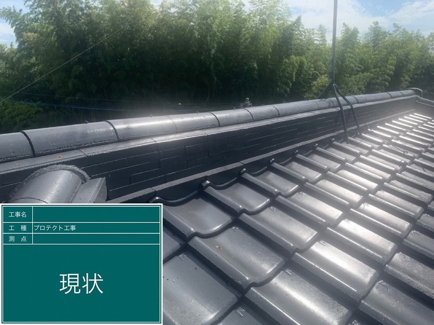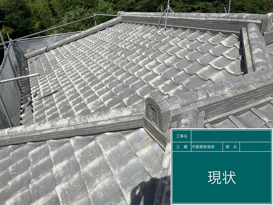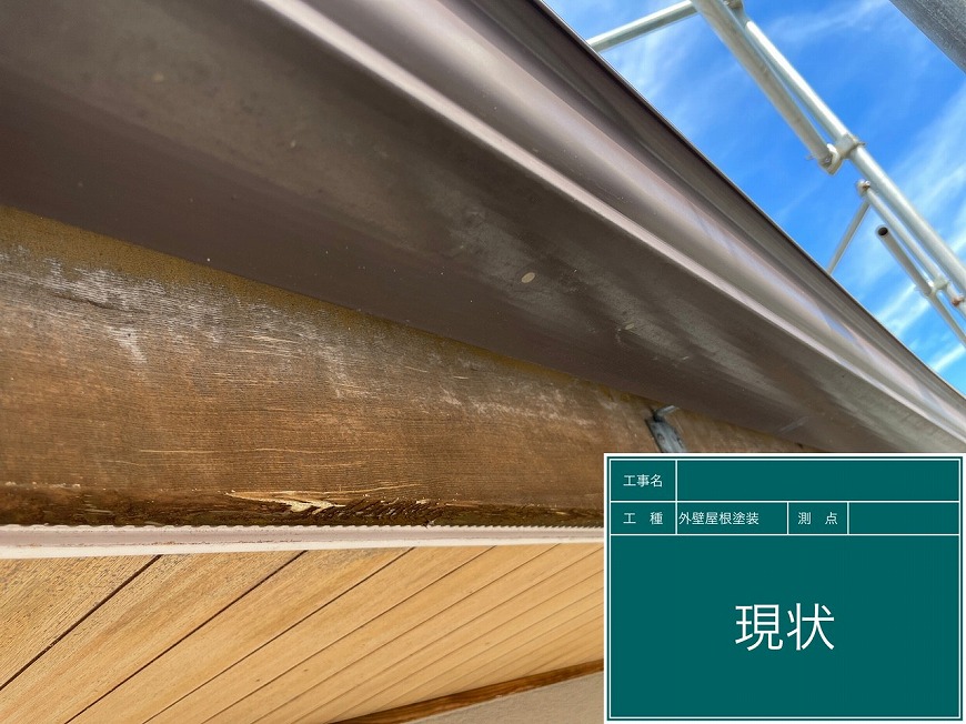 屋根は塗膜がなくなっていた。屋根は漆喰が取れていて、冠瓦(頂上)のパーツがグラついていた。木部は乾いていた。雨樋は塗膜がなくなっていた。