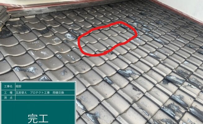 ご相談 2階の瓦が1階に落下し、数枚粉砕しており、そこから雨が侵入して雨漏りが発生していた。工事内容 1.瓦の差し替え工事 2.軒、袖、谷、壁際のプロテクト工事