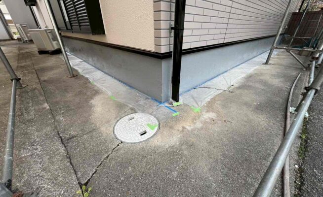 ご相談 基礎が割れていた。工事内容 1.高圧洗浄 2.高圧洗浄 3.クラック補修 4.パワーアラストFL 5.トップコート 6.完工