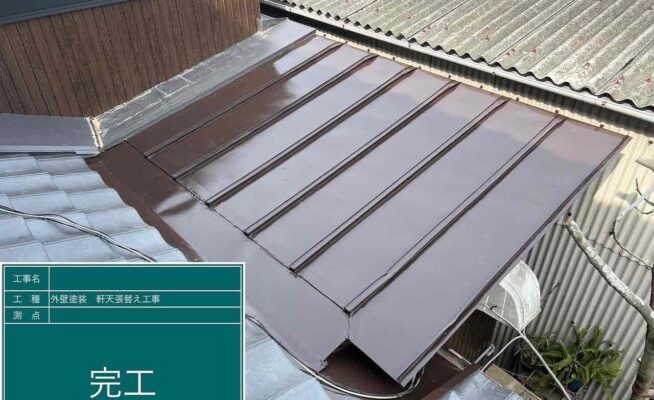 ご相談 板金屋根は塗膜がなくなり錆が出始めていた。玄関周りは木部が乾いてきていた。工事内容 1.ケレン(下地処理) 2.錆止め 3.日本ペイントファインパーフェクトトップ2回塗り 4.完工