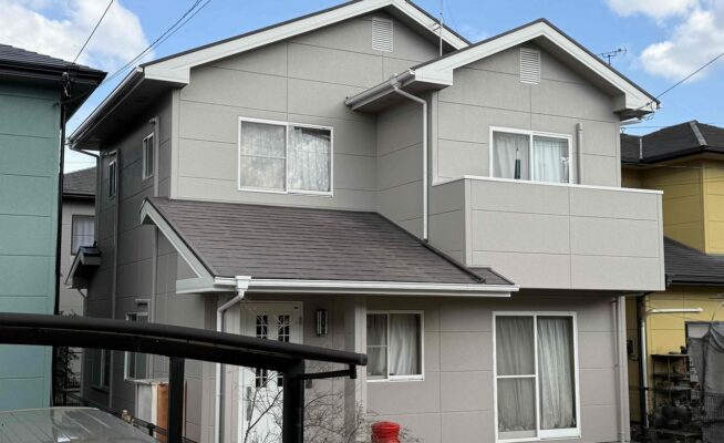 ご相談 外壁の塗膜が薄くなっており、防水機能が弱まっていた。工事内容 1.足場設置 2.高圧洗浄 3.養生 4.目地シーリング工事 5.外壁塗装3回塗り 6.その他付帯塗装工事 7.足場解体 7.完工