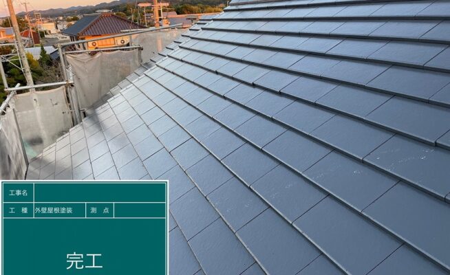 ご相談 屋根は塗膜がなくなっていた。工事内容 1.足場設置 2.高圧洗浄 3.養生 4.外壁クラック補修 5.外壁塗装工事(3回塗り) 6.屋根塗装工事(3回塗り) 7.雨樋その他付帯工事 8.ベランダ防水工事 9.足場解体