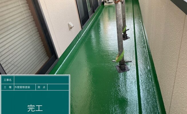ご相談 ベランダは防水機能が若干弱まっていた。工事内容 1.足場設置 2.高圧洗浄 3.養生 4.外壁クラック補修 5.外壁塗装工事(3回塗り) 6.屋根塗装工事(3回塗り) 7.雨樋その他付帯工事 8.ベランダ防水工事 9.足場解体