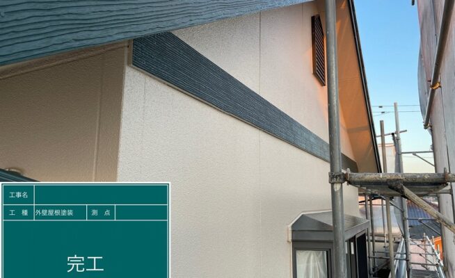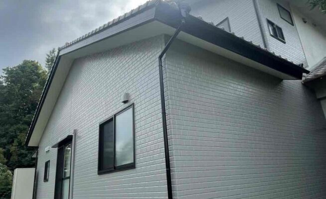 ご相談 外壁は塗膜が薄くなってきており、チョーキングとコケが発生していた。破風の塗膜も薄くなってきていたので塗装した。工事内容 1.足場設置 2.高圧洗浄 3.養生 4.外壁塗装工事(3回塗り) 5.雨樋、その他塗装工事 6.足場解体