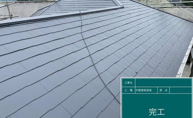 ご相談 屋根は塗膜がなく、コケが生えており、クラック(割れ)も数枚あった。軒天は全体的に劣化がひどく、垂れ下がっていたりして塗装不可の状態だったため張替えることにした。工事内容 1.仮設足場設置 2.高圧洗浄 3.養生 4.屋根塗装工事(3回塗り) 5.外壁塗装工事(3回塗り) 6.雨樋、その他付帯塗装工事 7.軒天張替え工事 8.足場解体