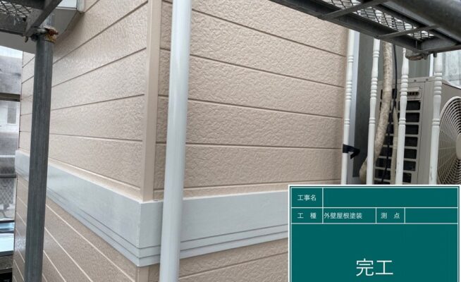 ご相談 モルタル壁は塗膜がなく、チョーキングが起こっていた。 トタン壁は釘が錆びてきていた。軒天は全体的に劣化がひどく、垂れ下がっていたりして塗装不可の状態だったため張替えることにした。工事内容 1.仮設足場設置 2.高圧洗浄 3.養生 4.屋根塗装工事(3回塗り) 5.外壁塗装工事(3回塗り) 6.雨樋、その他付帯塗装工事 7.軒天張替え工事 8.足場解体