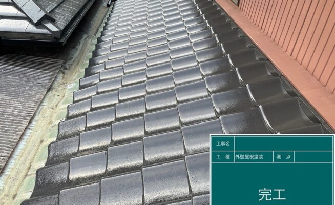 ご相談 塗膜がなく、コケが生えており、クラック(割れ)もあった。工事内容 1.高圧洗浄 2.屋根クラック補修 3.太陽光周り養生 4.屋根塗装(3回塗り) 5.ベランダ防水工事(3回塗り) 6.屋根漆喰工事