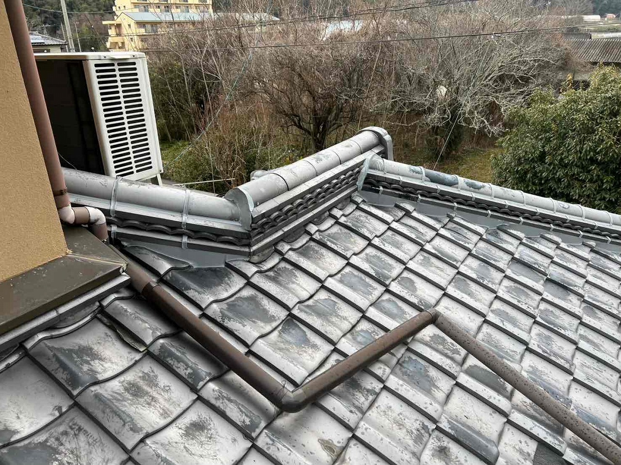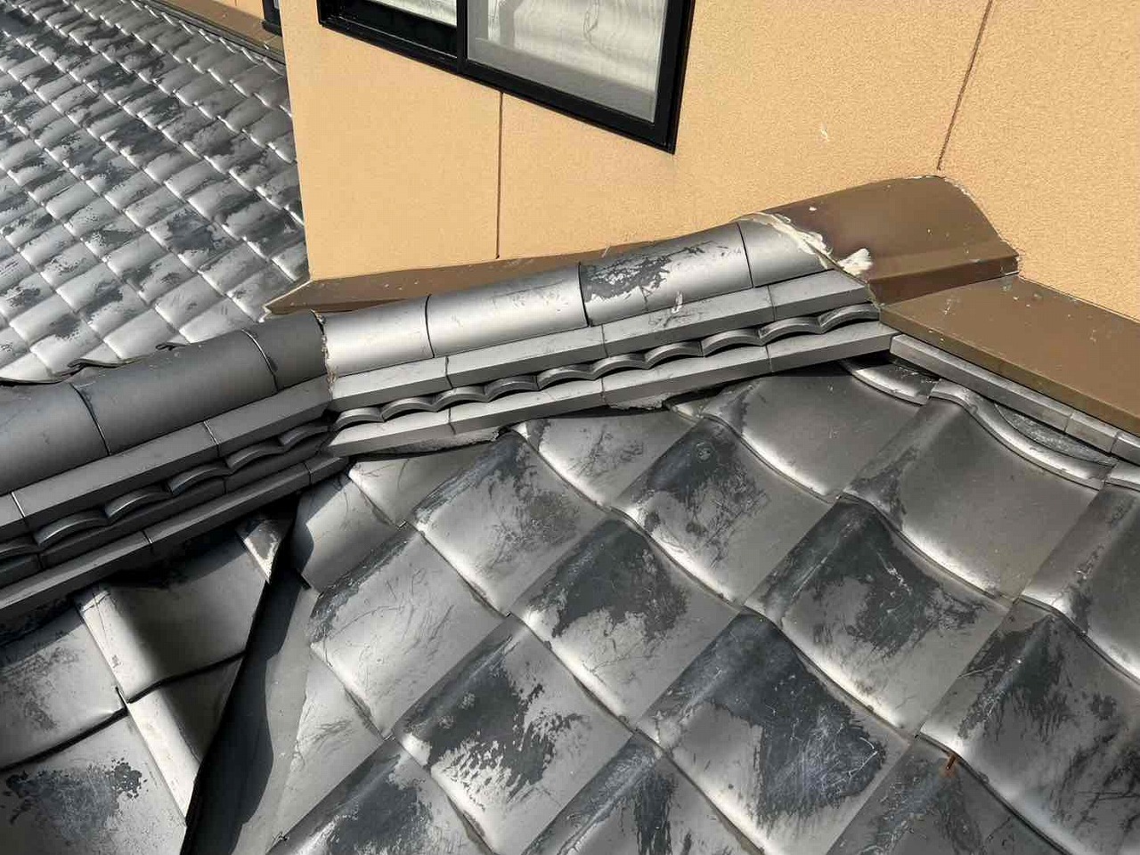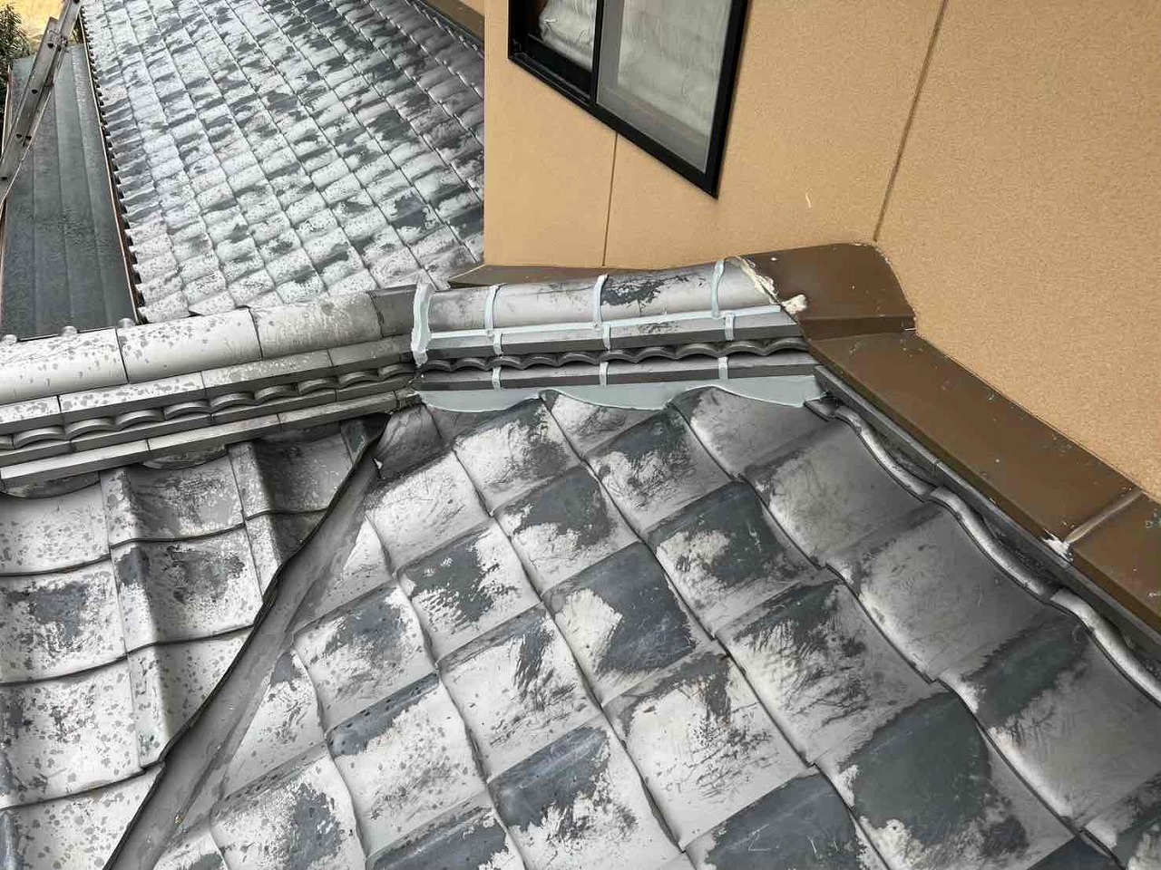 劣化した漆喰部分をシリコン材を使い、専門の職人にて施工させていただきました。この工事を行うことにより、瓦の棟崩れの防止や雨水の浸入(雨漏り)を防ぐことができます!