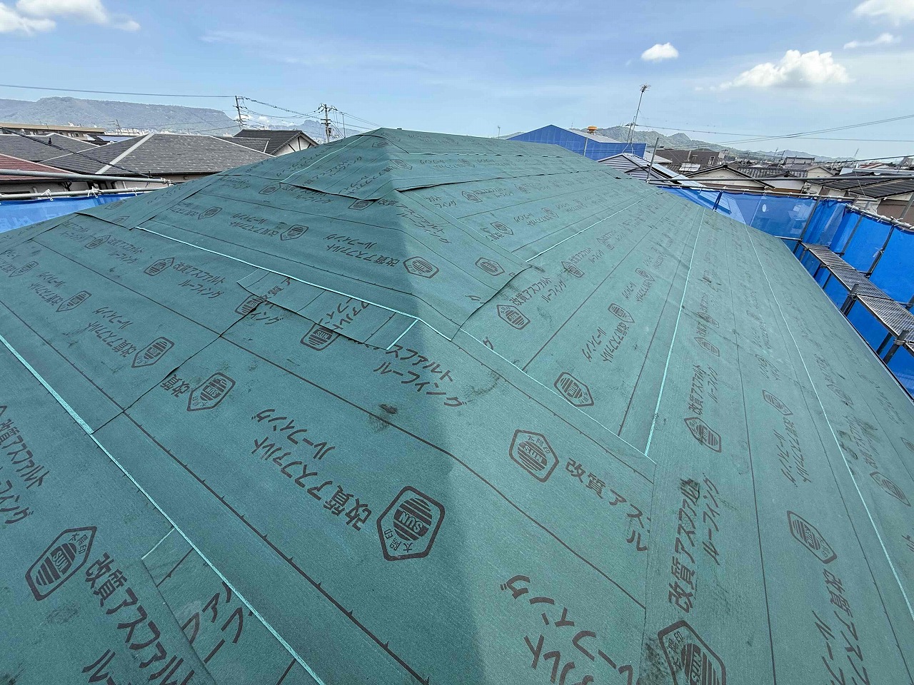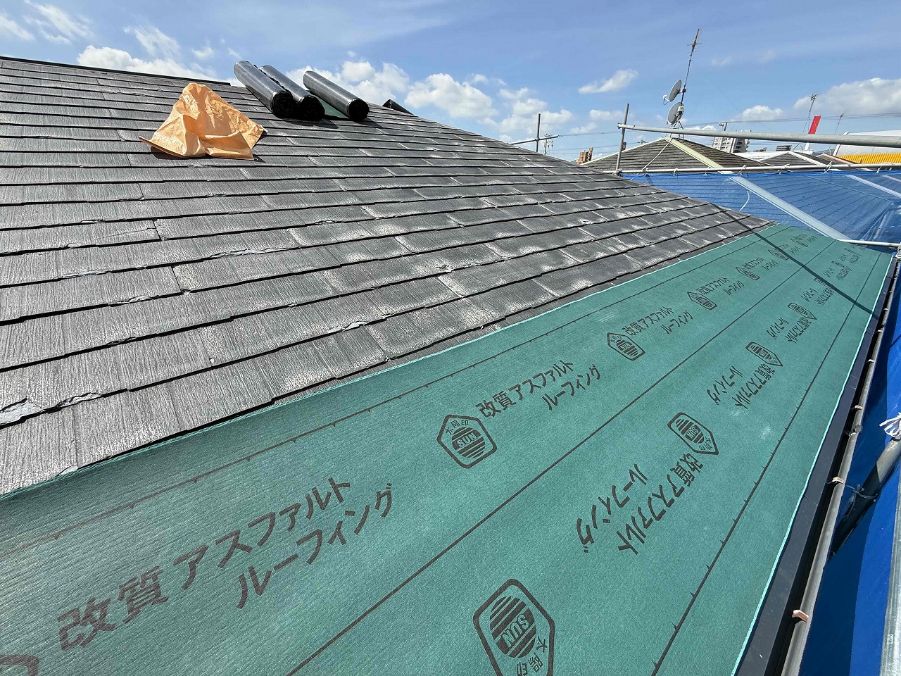 1.足場設置 2.下地調整 3.ルーフィング(防水シート)施工 4.屋根カバー工法(Tルーフ) 5.完工