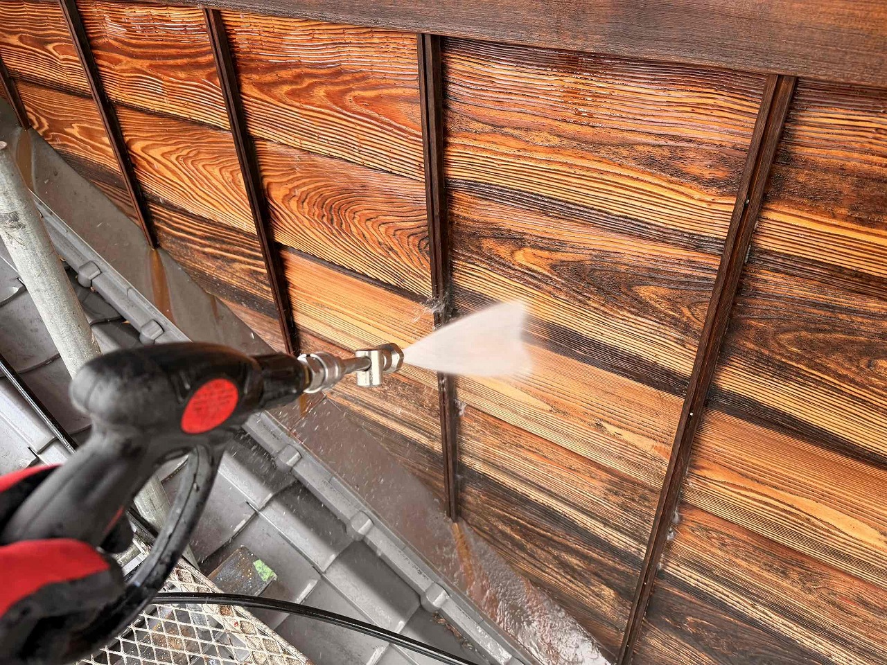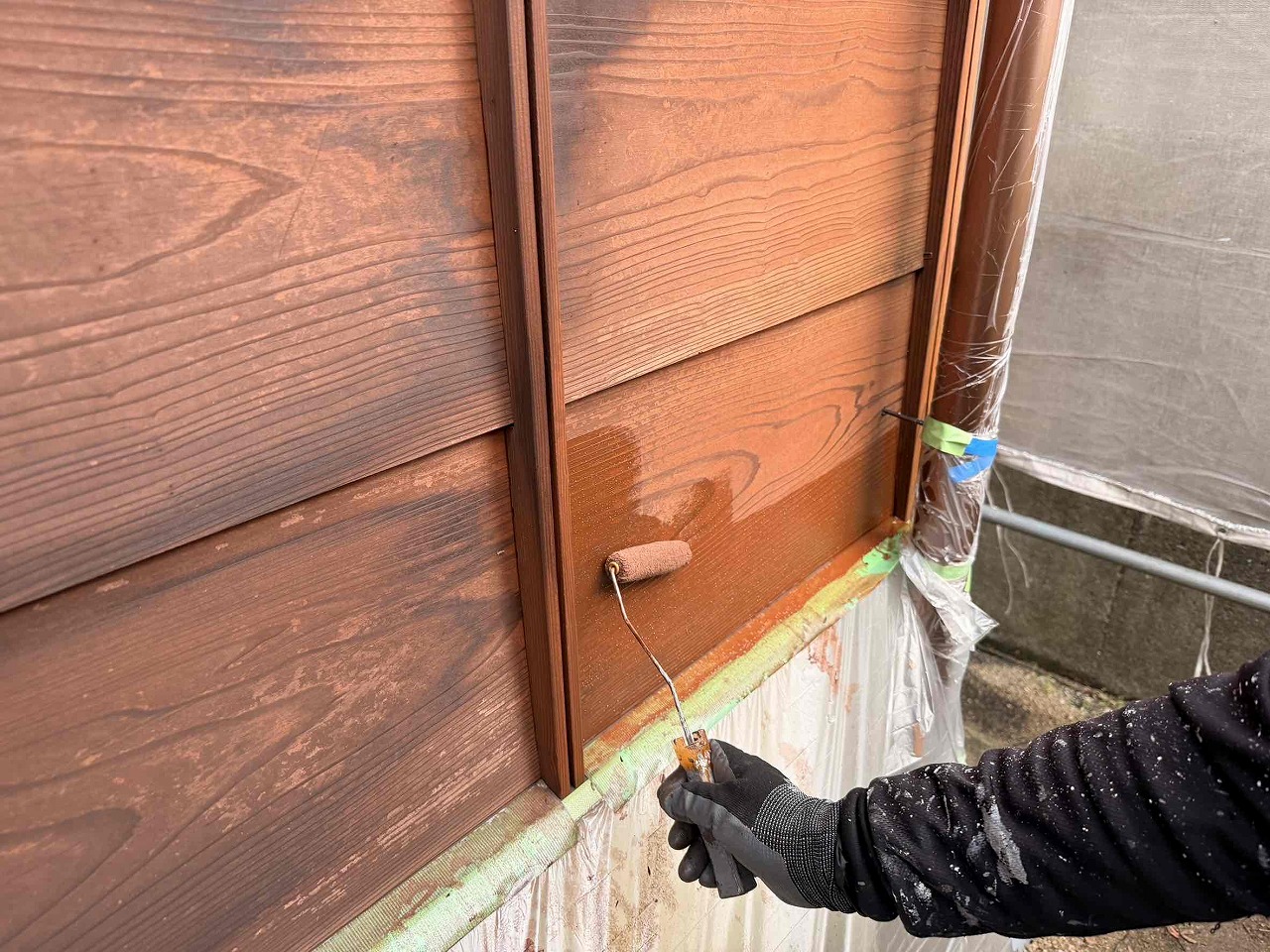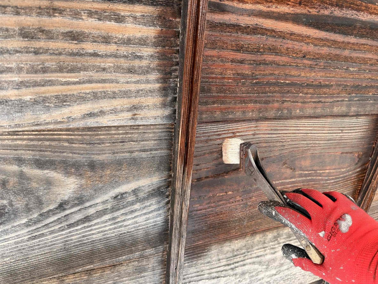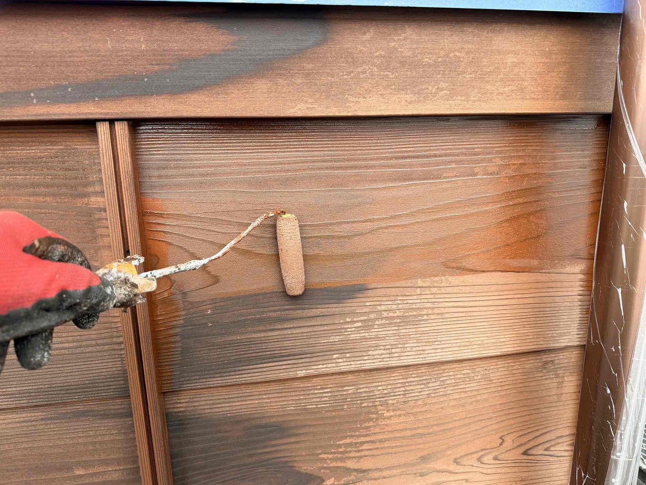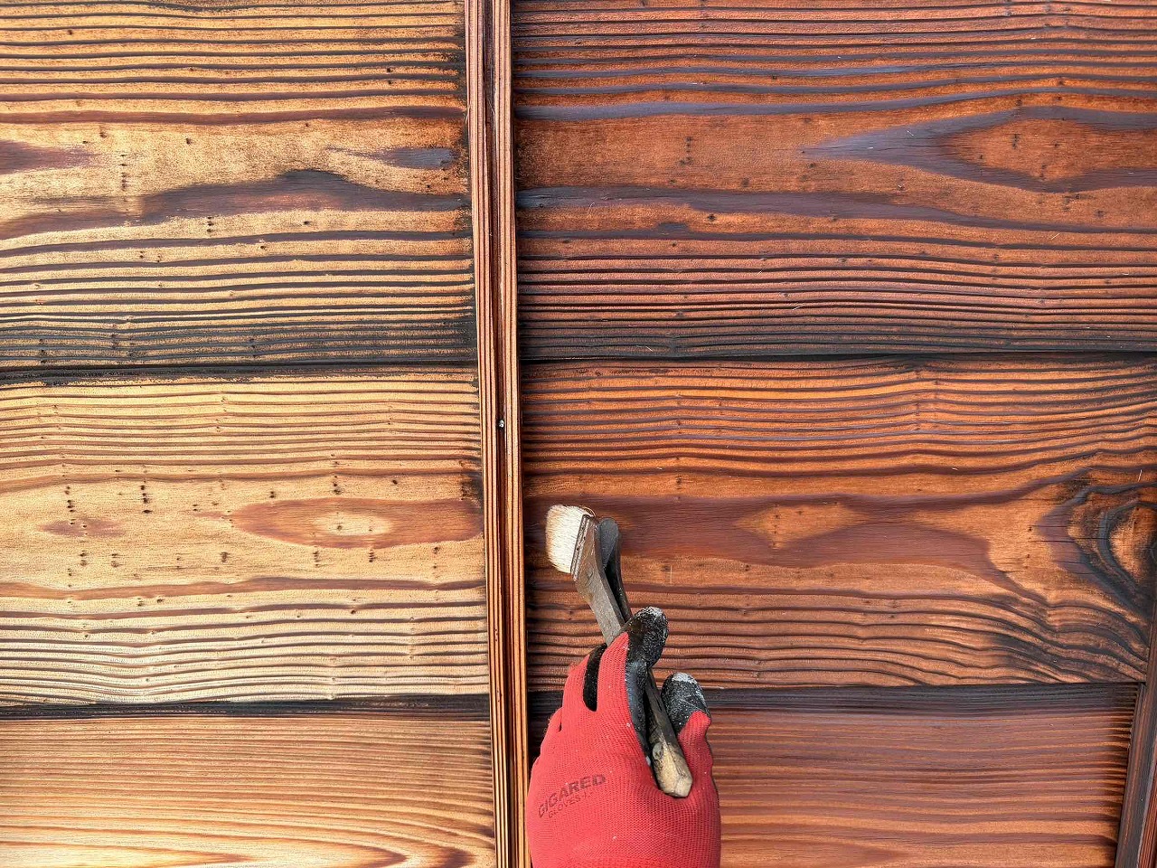 木部防腐剤塗装は写真の通り、塗装直後はピカピカですが、時間が経つと見た目が少しだけ元の状態に近づく(元の状態による)箇所もございます。