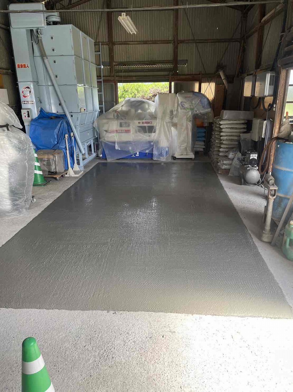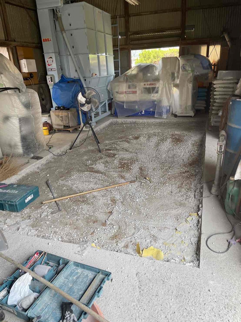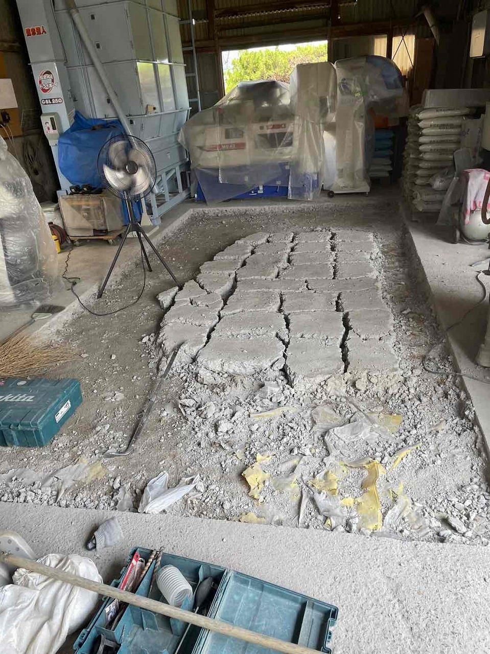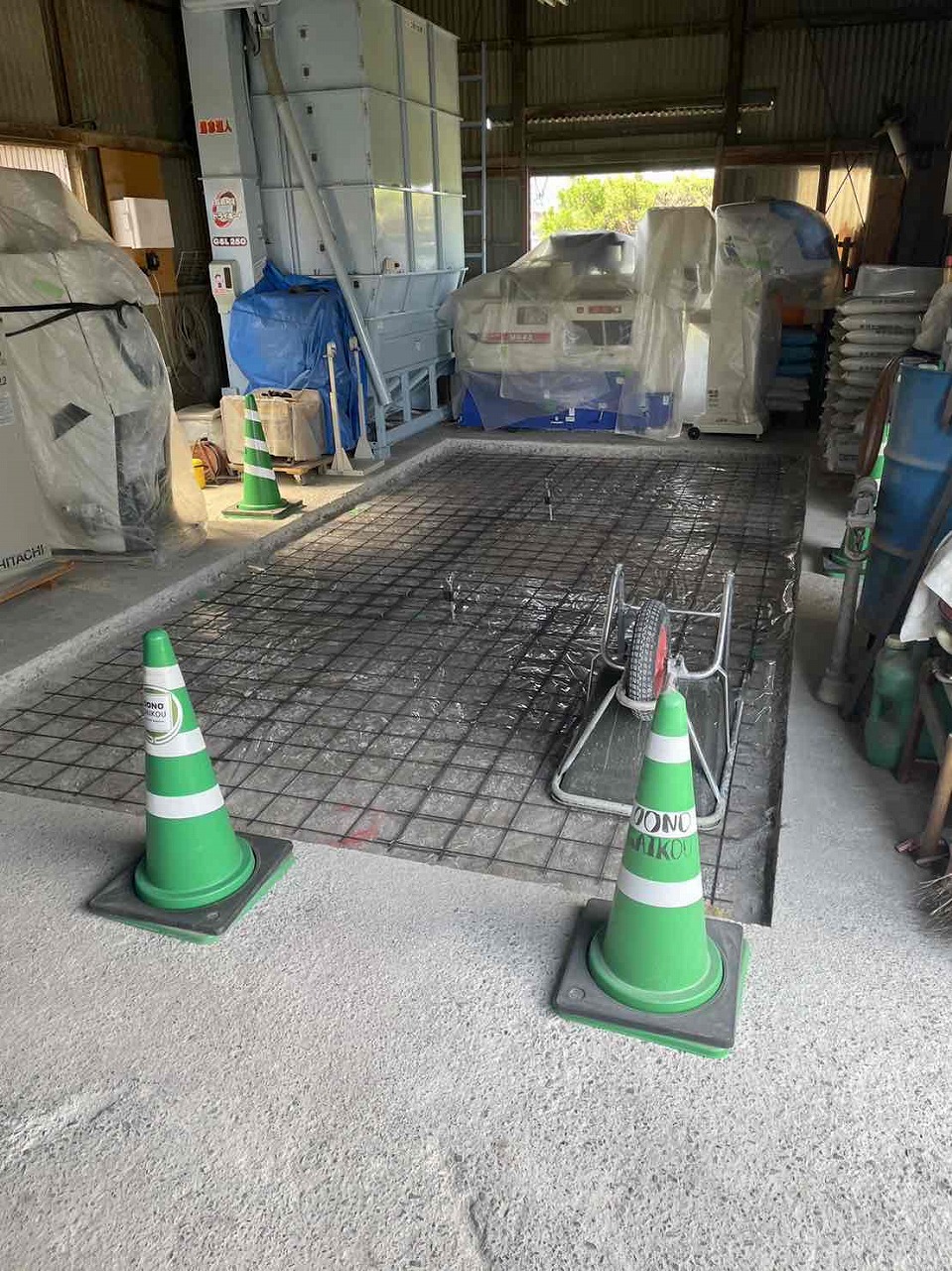 1.既存土間カッター 2.ハツリ撤去 3.下地調整 4.メッシュ設置 5.生コン(土間打ち) 6.左官 7.完工