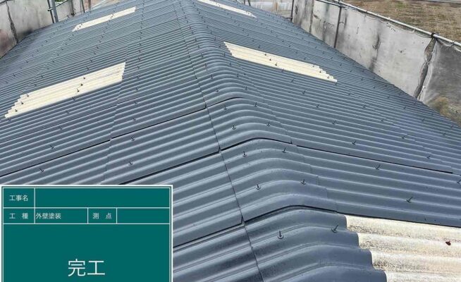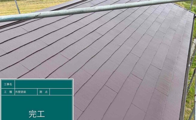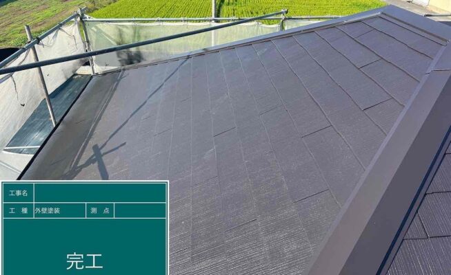 ご相談 スレート屋根の塗膜が薄くなっており、防水機能が弱まっていた。工事内容 1.足場設置 2.高圧洗浄 3.屋根塗装3回塗り 4.足場解体 5.完工