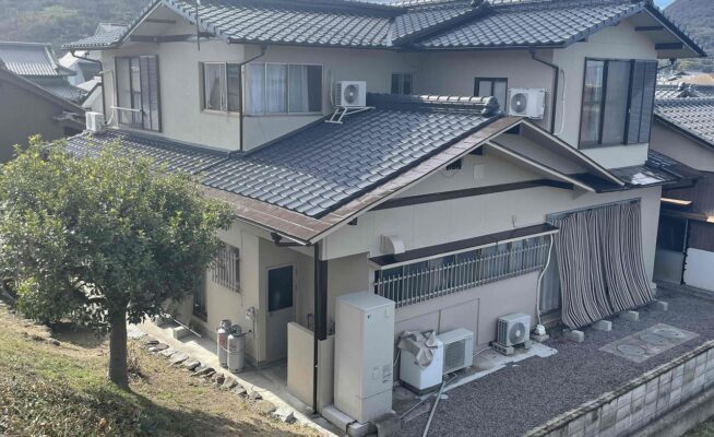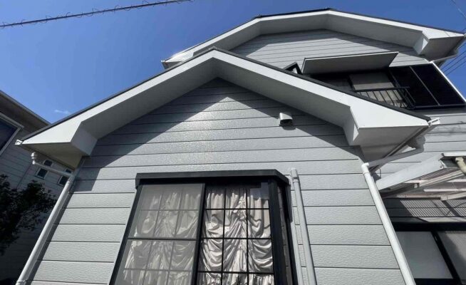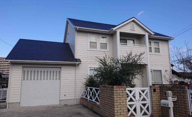 ご相談 外壁の塗膜が薄くなっており、防水機能が弱まっていた。工事内容 1.足場設置 2.高圧洗浄 3.養生 4.外壁塗装3回塗り 5.雨樋等その他付帯塗装工事 6.足場解体 7.完工
