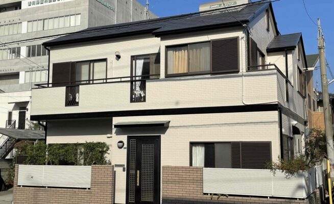 ご相談 外壁の塗膜が薄くなっており、防水機能が弱まっていた。工事内容 1.足場設置 2.高圧洗浄 3.養生 4.外壁塗装3回塗り 5.その他付帯塗装工事 6.足場解体 7.完工
