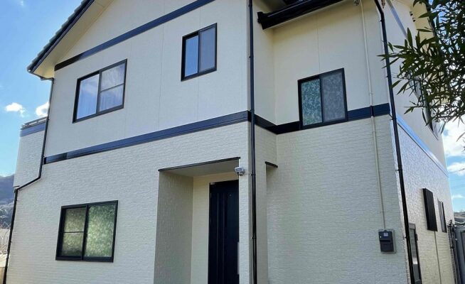 ご相談 外壁の塗膜が薄くなっており、防水機能が弱まっていた。工事内容 1.足場設置 2.高圧洗浄 3.コーキング 4.外壁塗装3回塗り 5.雨樋等その他付帯塗装工事 6.足場解体 7.完工