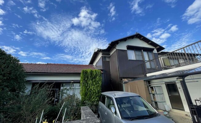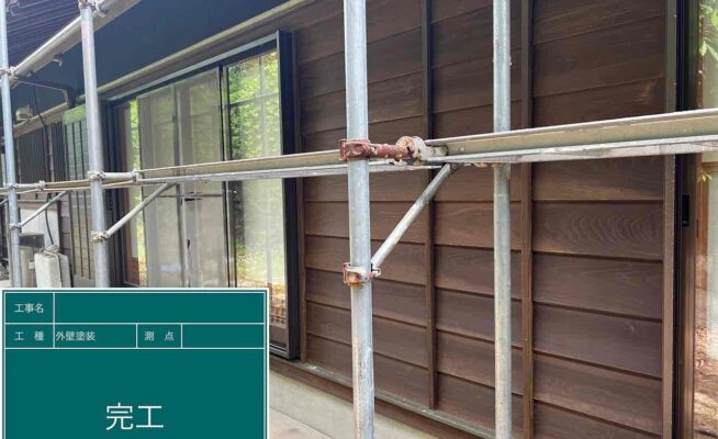 ご相談 外壁の塗膜が薄くなっており、防水機能が弱まっていた。工事内容 1.足場設置 2.高圧洗浄(ケレン) 3.養生 4.外壁塗装(3回塗り) 5.その他付帯塗装工事 6.足場解体 7.完工