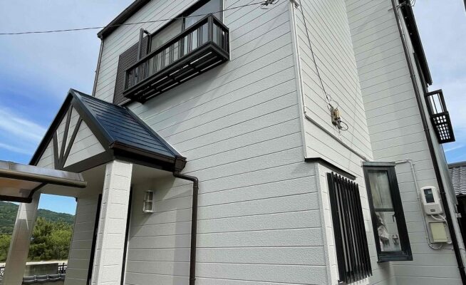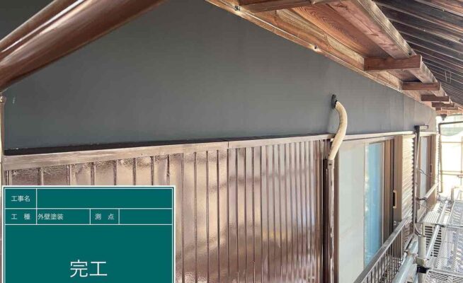 ご相談 外壁の塗膜が薄くなっており、防水機能が弱まっていました。工事内容 1.足場設置 2.ケレン作業 3.養生 4.外壁塗装3回塗り 5.雨樋など付帯塗装工事 6.足場解体 7.完工