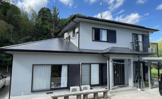 ご相談 外壁の塗膜が薄くなっており、防水機能が弱まっていた。工事内容 1.足場設置 2.高圧洗浄 3.養生 4.コーキング・外壁塗装3回塗り 5.雨樋等その他付帯塗装工事 6.足場解体 7.完工