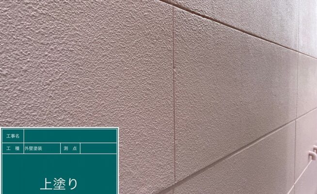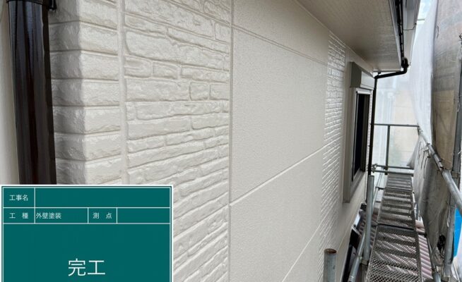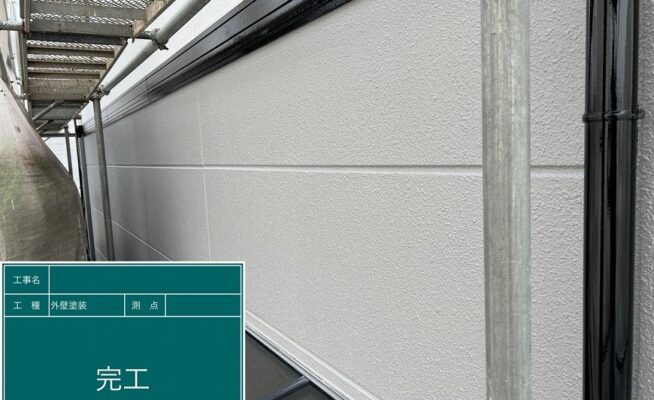 ご相談 外壁は塗膜はそこそこあるが、表面の塗料がめくれている箇所が数十か所あった。塀は長年雨風にさらされていて汚れていた。工事内容 1.足場設置 2.高圧洗浄 3.養生 4.外壁下地調整 5.外壁塗装工事(3回塗り) 6.雨樋その他付帯塗装工事 7.ベランダ防水工事(3回塗り) 8.塀塗装(2回塗り)リシン吹付 9.足場解体