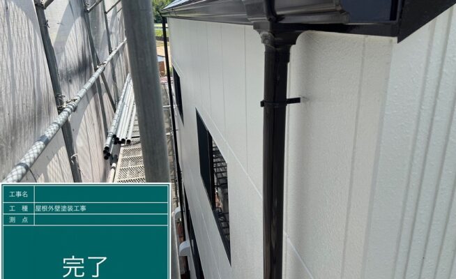 ご相談 外壁は塗膜がなくチョーキングとクラックが出ていた。谷の瓦が落ちており、雨水が侵入するようになっていた。シャッターは錆が出ていた。工事内容 1.仮設足場設置 2.高圧洗浄 3.養生 4.屋根塗装工事(3回塗り) 5.外壁クラック補修 6.板金工事 7.外壁塗装工事(3回塗り) 8.ベランダ防水工事(3回塗り) 9.足場解体 10.谷プロテクト工事