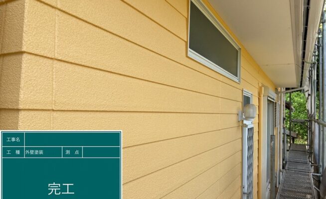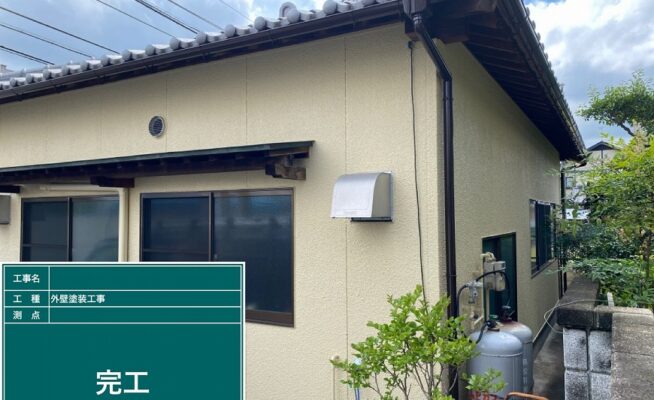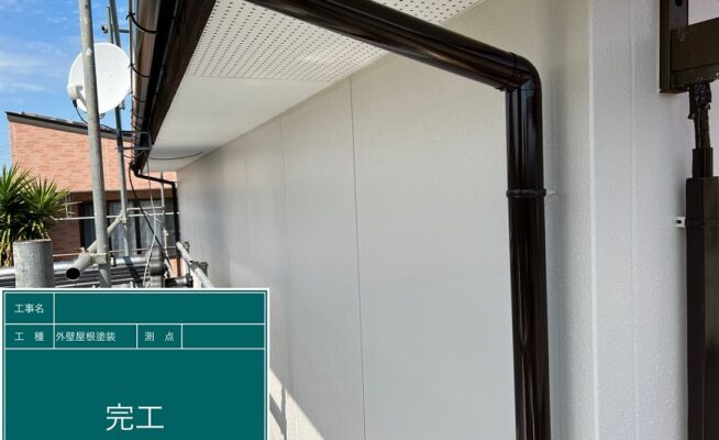 ご相談 外壁は塗膜がなくなってきて色褪せており、雨水等を吸収しやすい状態になっていた。工事内容 1.足場設置 2.高圧洗浄 3.養生 4.コーキング作業 5.外壁塗装工事(3回塗り) 6.軒天塗装工事 7.雨樋その他付帯塗装工事 8.ベランダ防水工事 9.足場解体