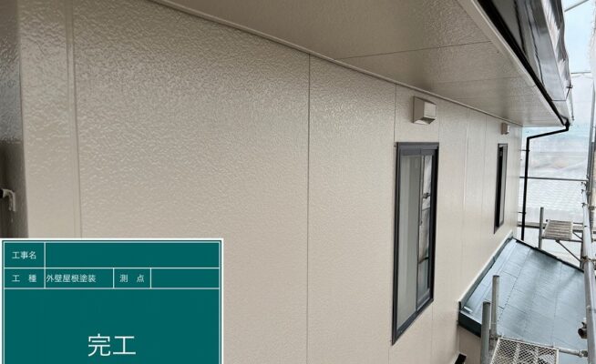 ご相談 塗膜が薄くなっており、チョーキングや目地のシーリングが所々劣化しており、割れているとことがあった。工事内容 1.足場設置 2.高圧洗浄 3.養生(外壁と太陽光パネル) 4.目地シーリング工事 5.外壁補修工事 6.屋根塗装工事(3回塗り) 7.外壁塗装工事(3回塗り) 8.雨樋等付帯塗装工事 9.ベランダ防水工事 10.足場解体