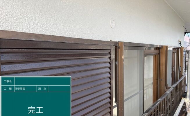 ご相談 外壁は塗膜がなく雨等を吸収しやすくなっており、所々クラック(割れ)があった。木部は少し腐食が進んでいた。工事内容 1.足場設置 2.高圧洗浄 3.養生 4.屋根塗装工事(3回塗り) 5.外壁塗装工事(3回塗り) 6.雨樋・戸袋・雨戸・木部・破風その他塗装工事 7.ベランダ防水工事(3回塗り) 8.足場解体