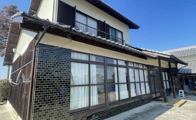 ご相談 モルタル壁は塗膜がなく雨を吸いやすい状態に劣化していた。トタンの壁は錆がうっすらでてきていた。木部は乾いて反ってきており、一部は欠け始めていた。雨樋は塗膜がなくなり、反ってはいなかったが塗装時期に入っていた。破風は前回ペンキで塗装されており、ペンキが乾燥してパリパリになっていた。 工事内容 1.足場設置 2.高圧洗浄 3.養生 4.外壁塗装工事(3回塗り) 5.雨樋その他付帯塗装工事 6.足場解体 7.木部キシラデコール塗装工事