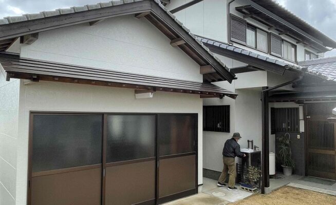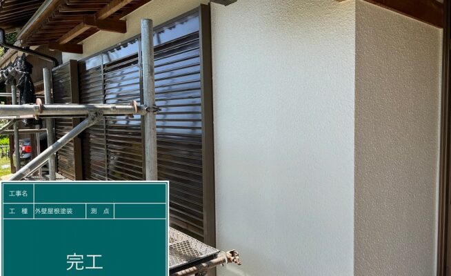 ご相談 母屋の外壁は塗膜がなくなっており、モルタルの壁に少しクラック(割れ)が出始めていた。車庫の壁はサイディングボードの塗膜がなくチョーキングが起きていた。またボードとボードの間のシーリングが劣化し、割れているところや取れてしまっているところがあった。工事内容 1.足場設置 2.谷プロテクト工事 3.高圧洗浄 4.養生 5.目地シーリング工事 6.外壁塗装工事(3回塗り) 7.雨樋その他付帯塗装工事 8.足場解体