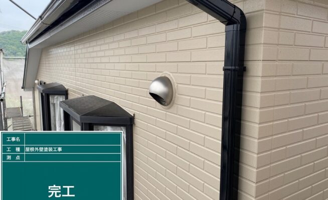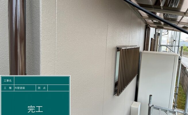 ご相談 外壁は少し塗膜が薄くなっていた。雨樋は表面の塗膜がなくなっていた。工事内容 1.足場設置 2.高圧洗浄 3.養生 4.外壁塗装工事(3回塗り) 5.ベランダ防水工事 6.雨樋塗装その他付帯工事 7.足場解体