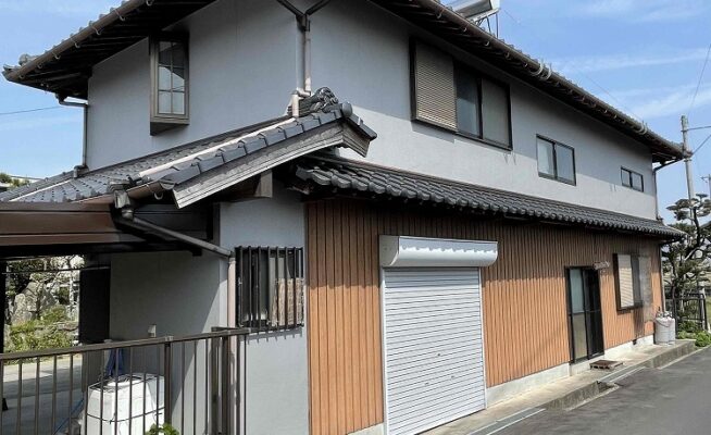ご相談 外壁は塗膜がなくなって色褪せていた。車庫は鉄骨部分に錆が出てきていた。工事内容 1.足場設置 2.高圧洗浄 3.ケレン 4.養生 5.外壁塗装工事(3回塗り) 6.車庫の錆止めウレタン塗装(3回塗り) 7.足場解体