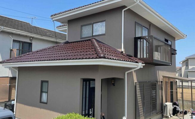 ご相談 スレート外壁の塗膜が薄くなっており、防水機能が弱まっていた。工事内容 1.足場設置 2.高圧洗浄 3.養生 4.外壁塗装3回塗り 5.雨樋等その他付帯塗装工事 6.足場解体 7.完工