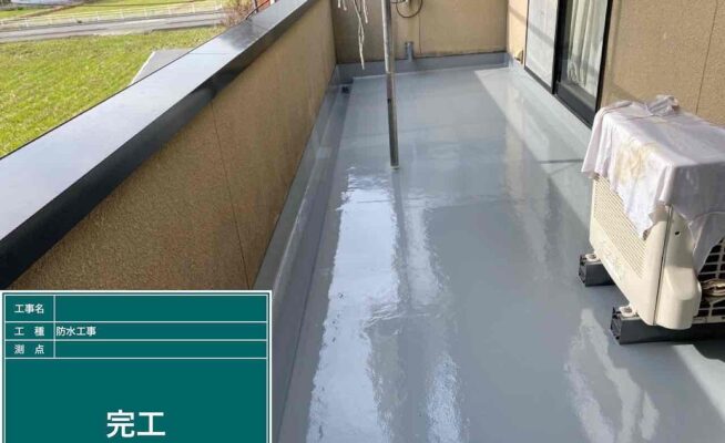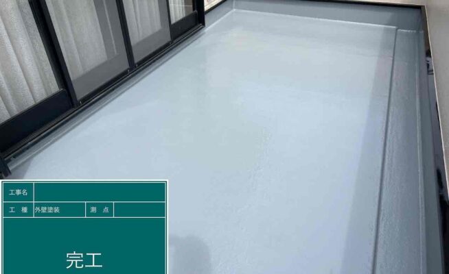 ご相談 塗膜が薄くなっており、防水機能が弱まっていました。工事内容 1.高圧洗浄 2.ベランダ防水工事(3回塗り) 3.完工