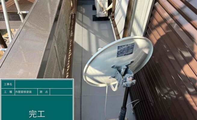 ご相談 屋根の塗膜が薄くなっており、防水機能が弱まっていました。工事内容 1.足場設置 2.高圧洗浄 3.養生 4.屋根塗装(3回塗り) 5.外壁塗装(3回塗り) 6.ベランダ防水工事 7.足場解体 8.完工