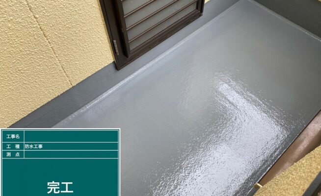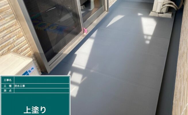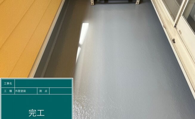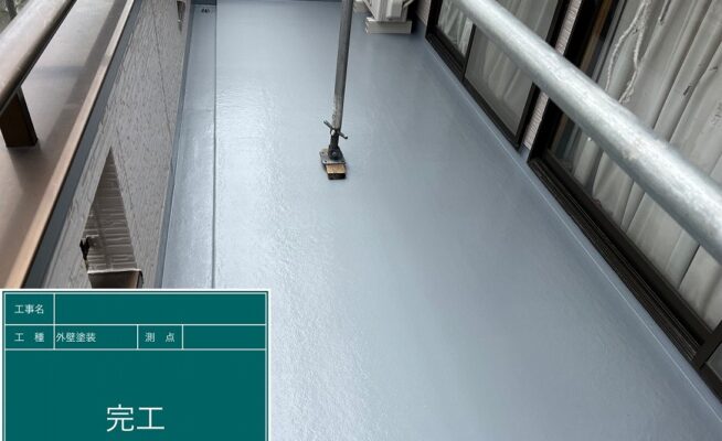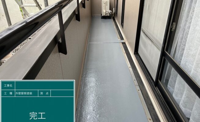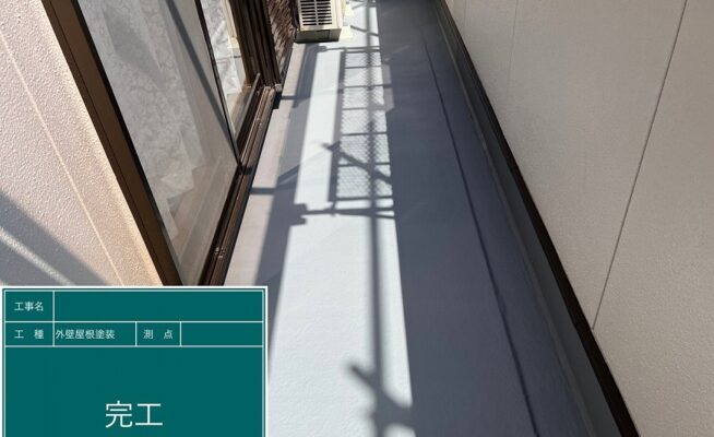 ご相談 ベランダの防水機能が少し弱くなっていた。目地は多数割れが出てきており、雨水等が侵入する経路ができていた。工事内容 1.足場設置 2.養生 3.目地コーキング一部撤去 4.目地コーキング工事 5.ベランダ防水工事(3回塗り) 6.足場解体